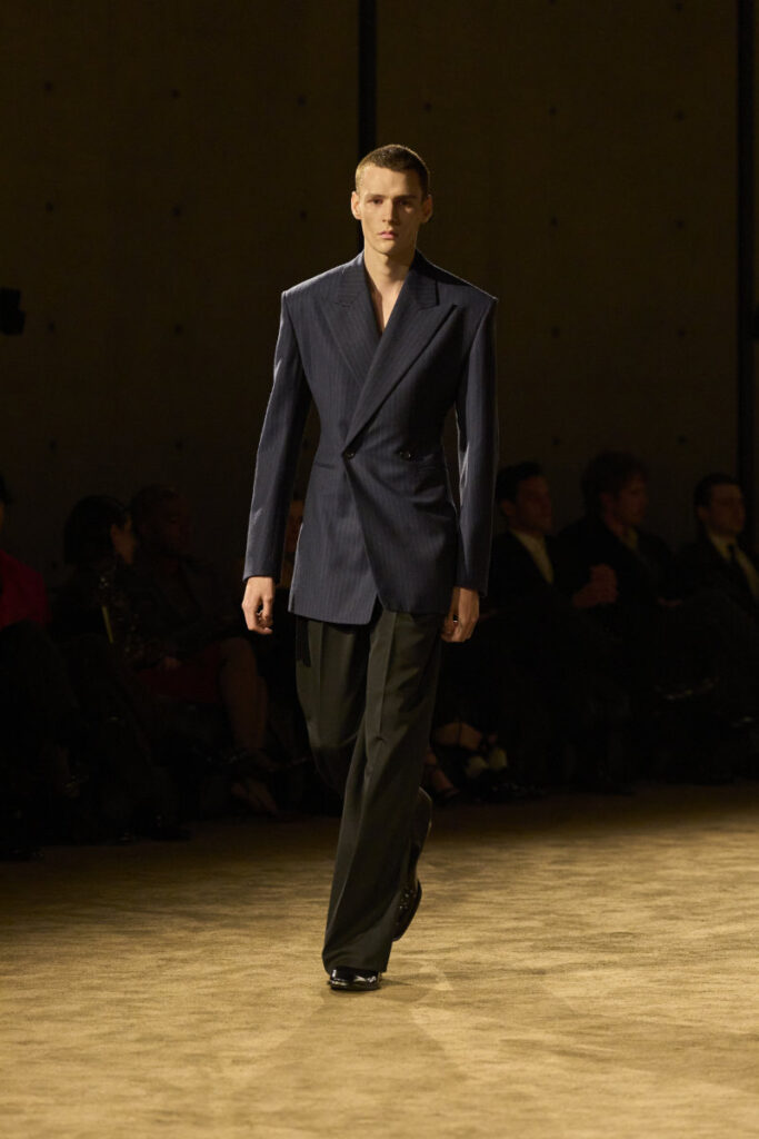 This season draws inspiration from James Baldwin’s “Giovanni’s Room,” a novel steeped in longing, identity, and emotional chiaroscuro. Vaccarello channels that atmosphere into silhouettes that feel intimate yet armored: elongated coats, razor‑cut shoulders, shadow‑drenched palettes, and fabrics that cling, glide, or conceal with intention.