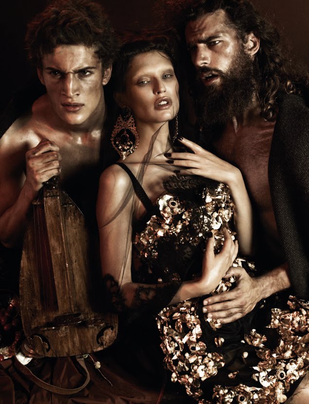 Baroque Fever–It’s an opulent baroque atmosphere the one captured by Giampaolo Sgura for the September 2012 issue of Interview Germany. Models Sam Webb, Aiden Shaw, Chris Petersen, Chris B. and Christos, pose for intriguing and captivating images beside Italian model Bianca Balti, as styled by Klaus Stockhausen. Clad in a sumptuous Dolce & Gabbana’s fall/winter 2012 wardrobe, the models provide appealing images, combining a luxury baroque opulence with a sensuous and lascivious decadence. / Hair by Davide Diodovich. Makeup by Jessica Nedza. Courtesy of – thefashionisto.com