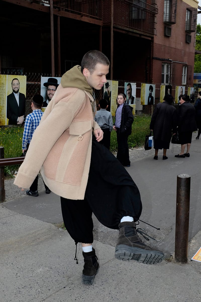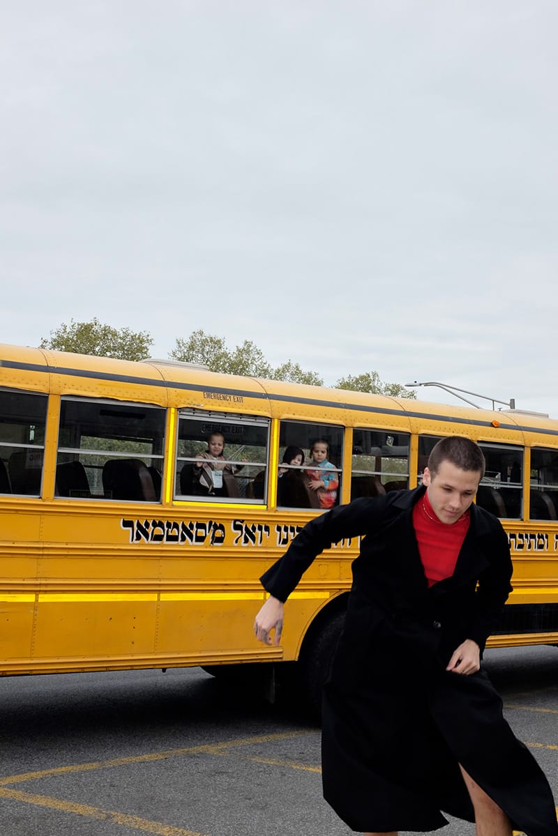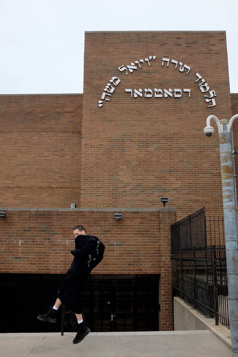 “We decided to make our model jump throughout the whole shoot in order to express this unleashed, and totally free positions, as a strong opposition to the way fashion is conveyed through traditional ‘poses’, to see fashion and clothes in a new way. We wanted to explore the antagonism between documentary and fashion through this story. We decided to follow the documentary aspect by shooting these jumps in the Hasidic Jewish neighbourhood in Brooklyn in order to create once again an obvious and extremely big gap between the New York fashion culture and the communautarism of the Jewish community, which is expressed so strongly in the geography of the landscape and in the way people dress.”