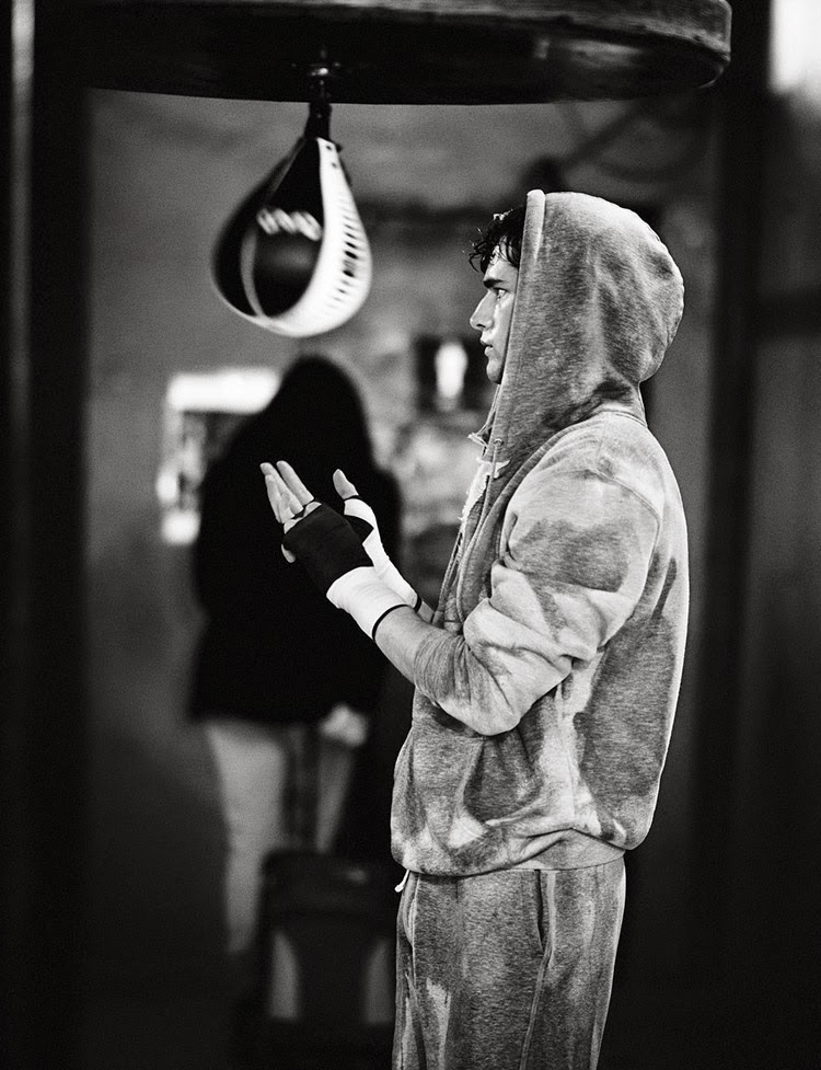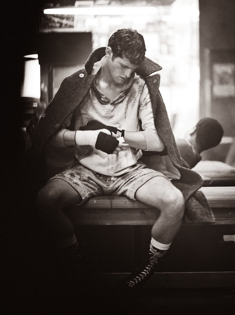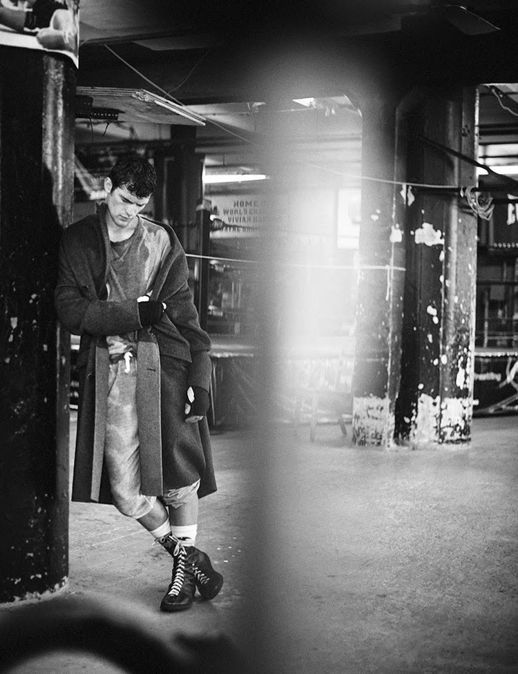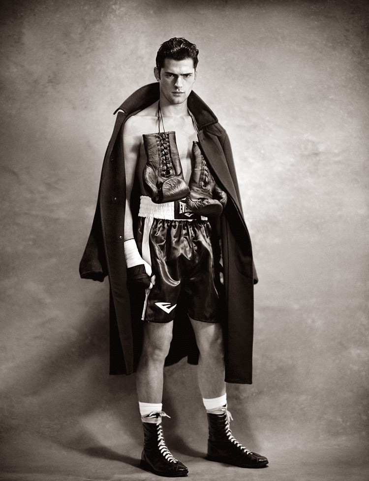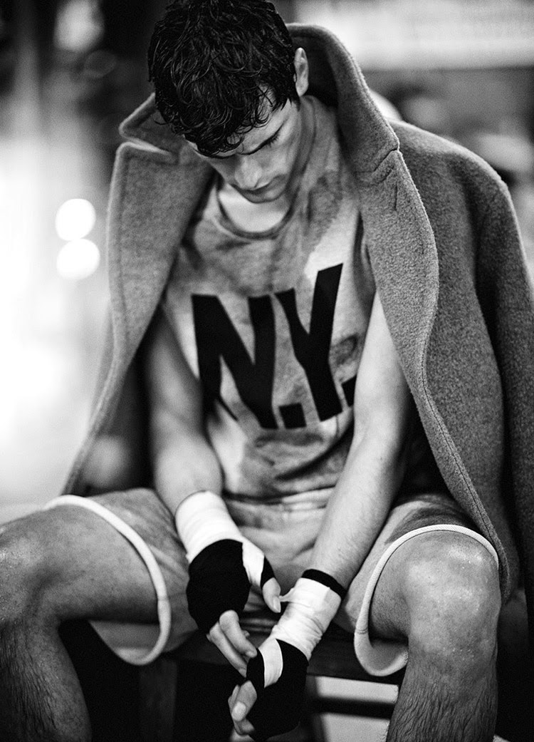 Kingsway–Following his story for the debut issue of Man of the World, American model Sean O’Pry returns to the magazine for a new editorial lensed by photographer Boo George. Taking on the role of boxer for his latest spread, Sean gets active in a mix of casual and formal styles. Picking up boxing gloves, Sean balances the comfortable aspect of hooded sweatshirts and baggy shorts with the tailored perspective of suits and structured coats.” – The Fashionisto