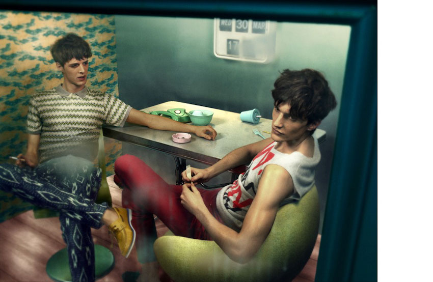 Hazardous Prints–Stylist Dean Hau and photographer Thomas Cooksey join forces to create a colorful and eclectic story for the July 2012 issue of Seventh Man magazine, featuring models Sebastian Sauvé, Charlie Timms and Benoni Loos. Outfitted with a colorful and variegated wardrobe, the model sport dramatic prints, eye-catching colors and graphic patterns, creating intriguing and youthful looks. / Hair by Ben Jones. Courtesy of – thefashionisto.com