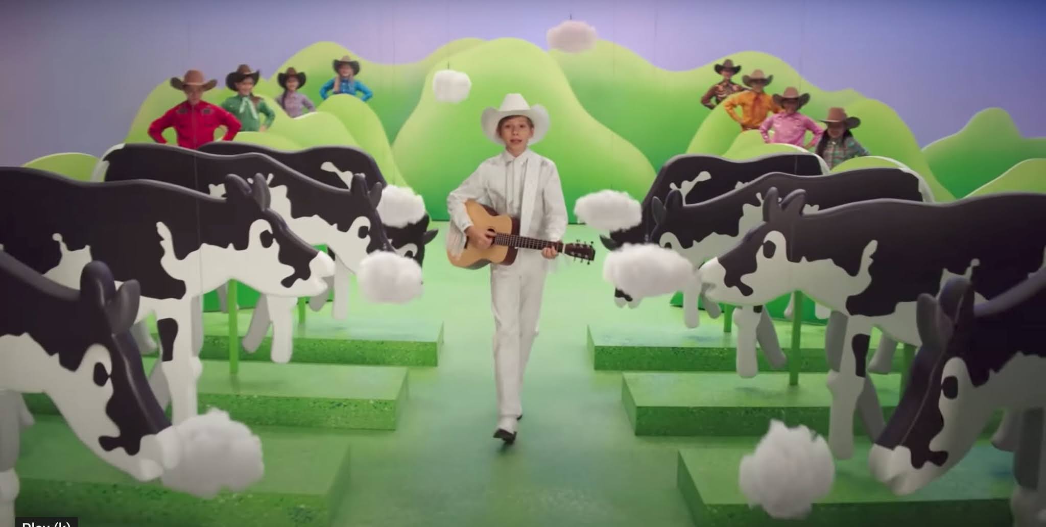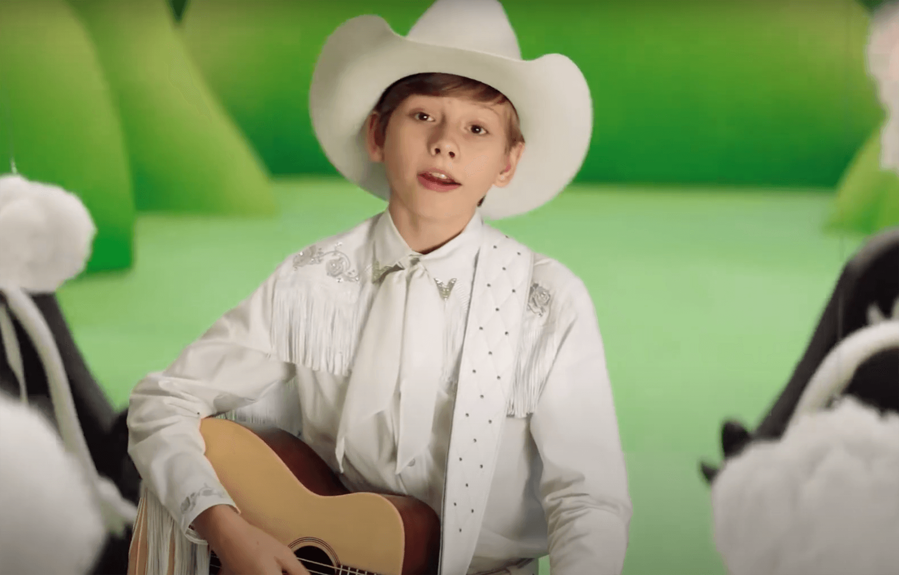 “When cows fart and burp and splatter/well it ain’t no laughing matter,” Ramsey sings, emerging from the rear-end of a cow, in an inexplicably clean and sparkling white suit. Things get even weirder — and apocalyptic — when the 13-year-old dons a rhinestone-studded gas mask to envision a world uninhabitable by human beings. “Reducing meth-aa-aa-aane, meth-aa-aa-aane,” Ramsey twangs in the “chorus.”