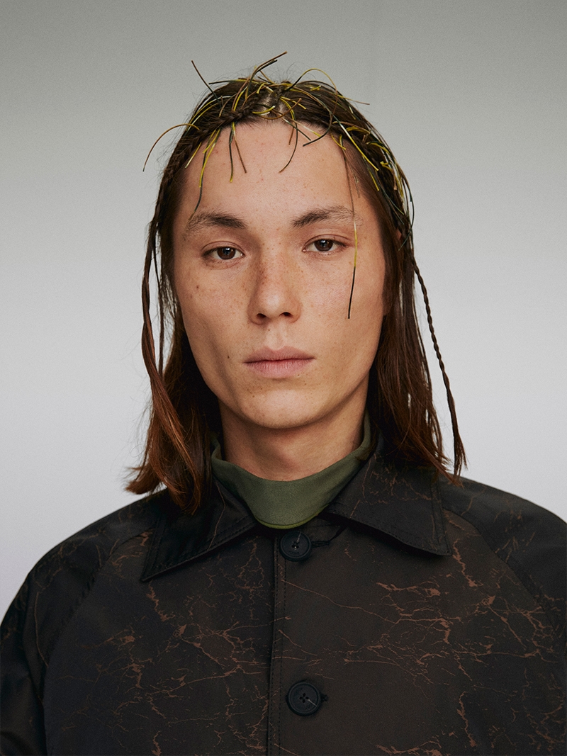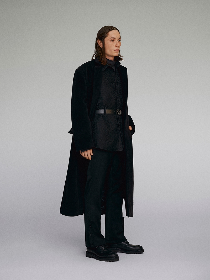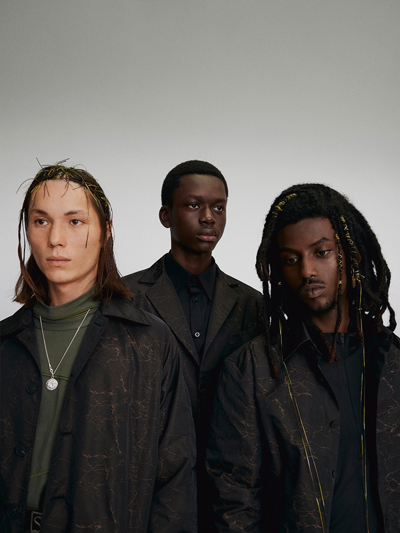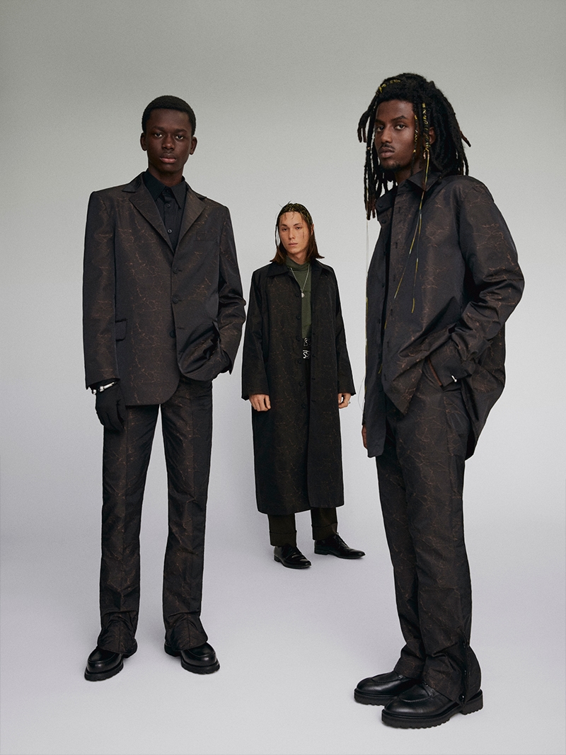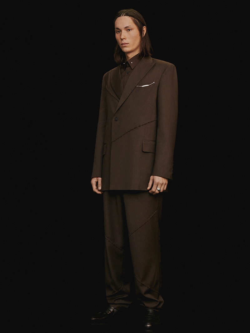 Although the suit is the main element, the collection is also made up of “shoe cover” pants, double-breasted shirts –where piercings become twins or tie pins–, garments composed of several layers, cuts and frayed and with chains and handmade leather coats. And they are combined with cracked prints, brocade fabrics and the already classic technical fabrics in strong colors.