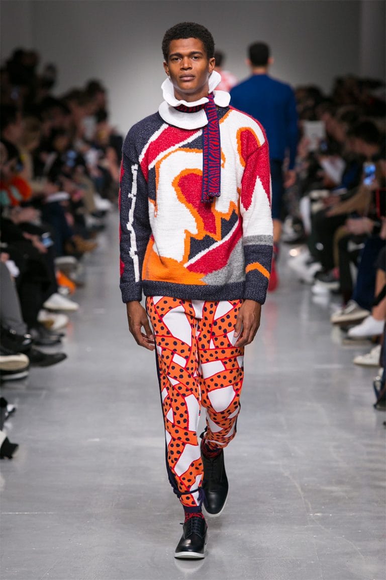 “We weren’t expecting to see so much patriotism in light of Brexit, but Sibling are never a duo prone to mourning through their designs, instead their shows are always highly anticipated due to their vibrant and joyful designs, seen on vibrant and joyful faces. It was a collection so seemingly British given the Union Jack pins, 60s “King’s Road” silhouettes and Edwardian ruffs (knitted of course), yet the invitation misled us with an image of cracked mosaic in a bright African-style print. Although they describe their design process and influences as mosaic-like, it’s a powerful message to all that Britian too is like a mosaic, and it takes all kinds of people to make a successful nation.