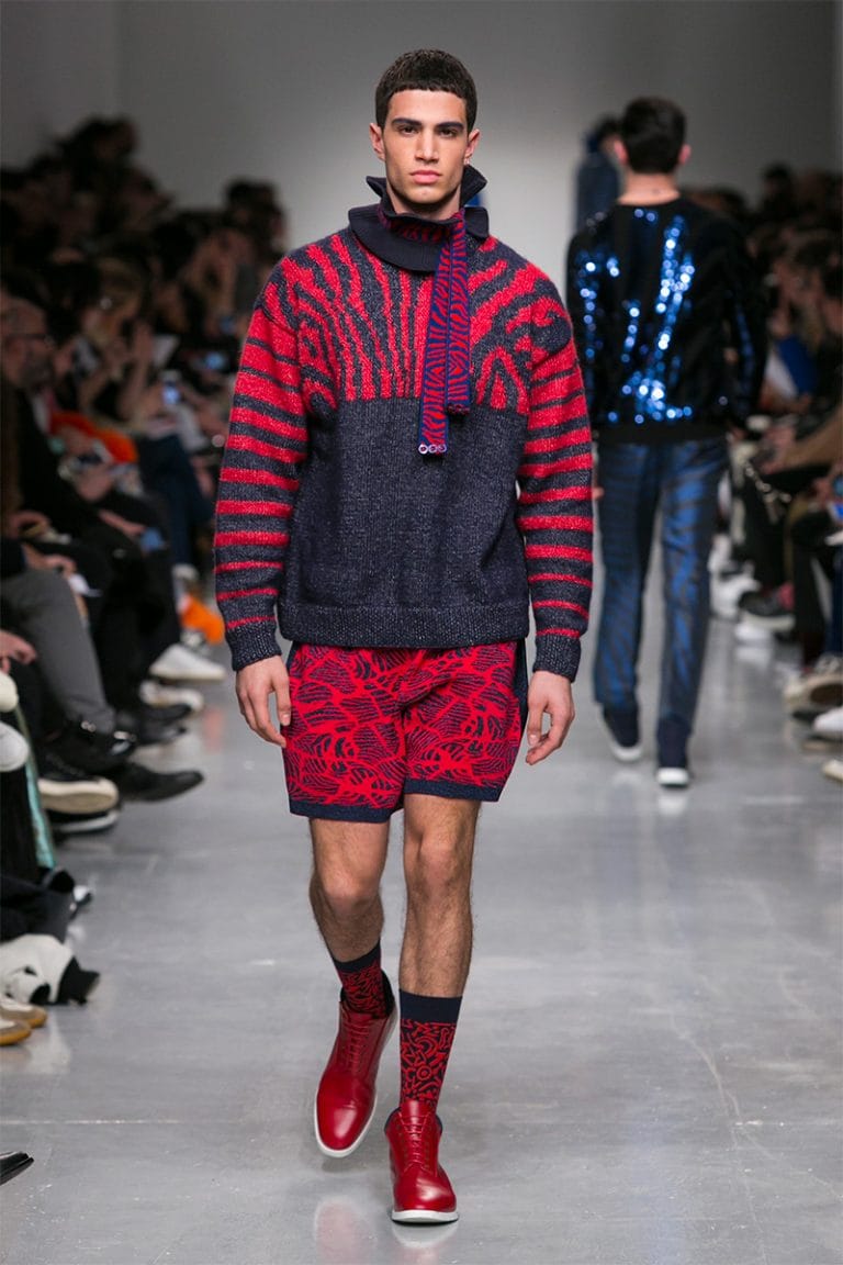 Citing other references such as Antoni Gaudí and Jamaican musician, Lee “Scratch” Perry, the prints this season were cell-like webs of undulating lines, in salmons and blues on tightly fitted suits with cropped trouser legs. Sequins made a return in an almost zebra style print; these were seen worn on jumpers, brocade trousers and bomber jackets, which seem to be the most popular jacket style this season.