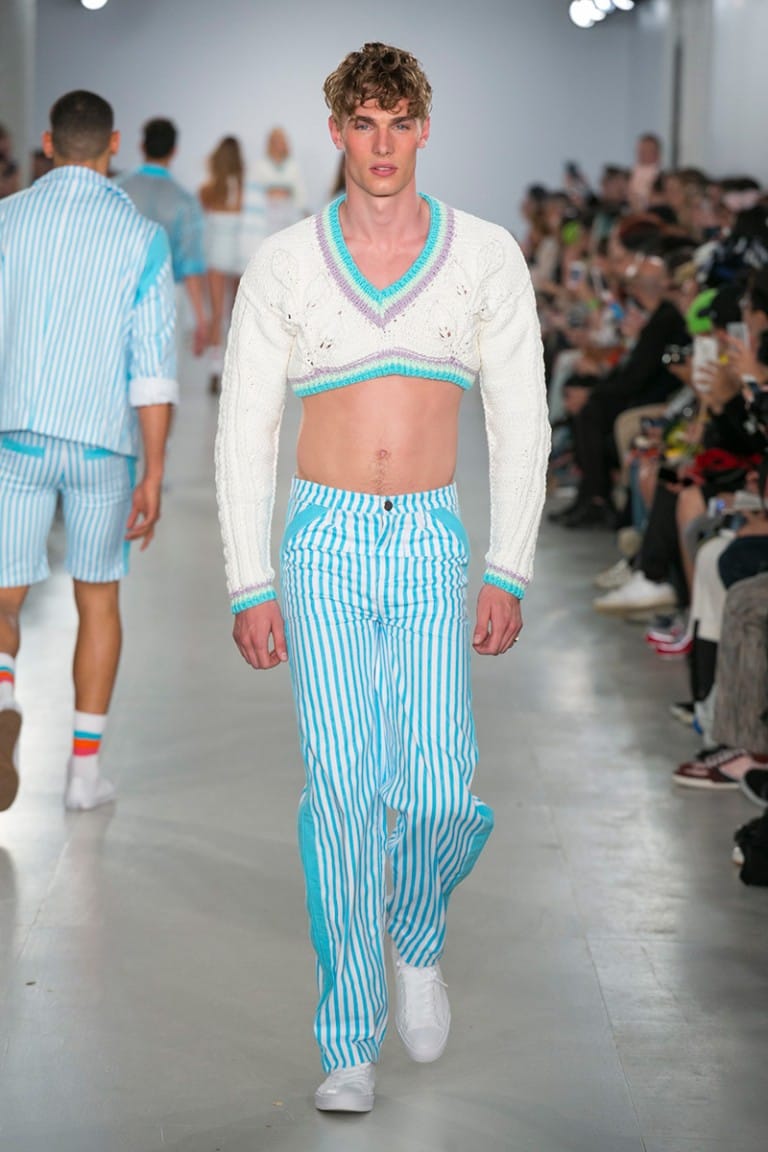 Introducing a new pattern to the Sibling graphic set, jaunty leaves were crocheted onto shorts and bomber jackets, as well as corsets on both the girls and the boys. Stripes went from sporty on the socks to deckchair-style on relaxed lounge-style suits and knitted beach towels. Jumpers were either cropped or haphazardly one-shoulder, while floor length robes returned for another season.
