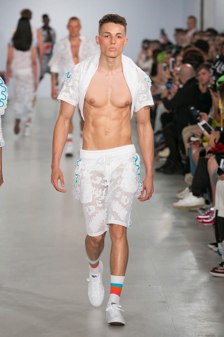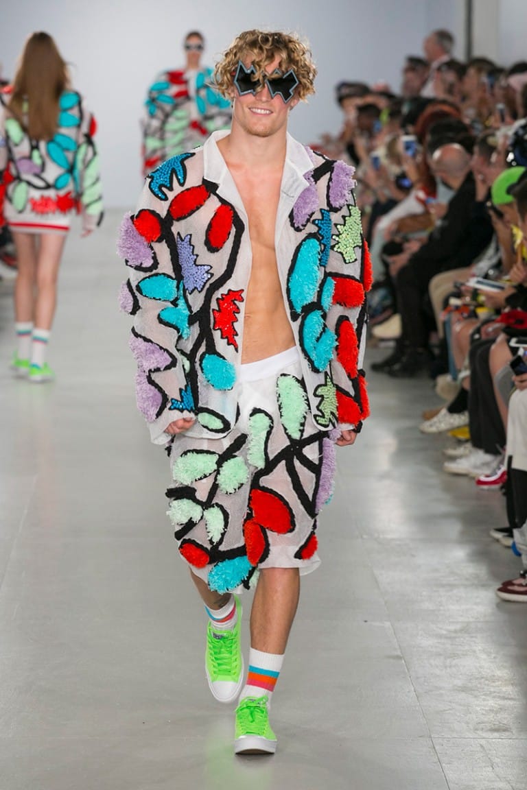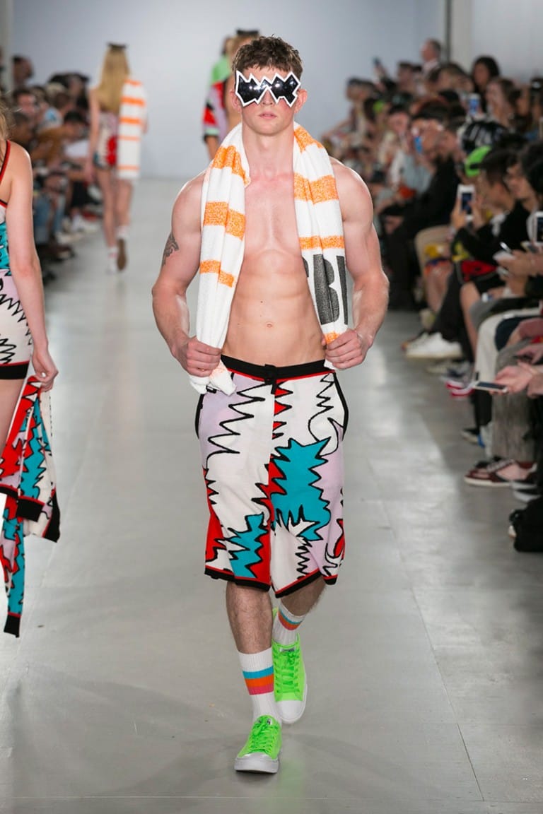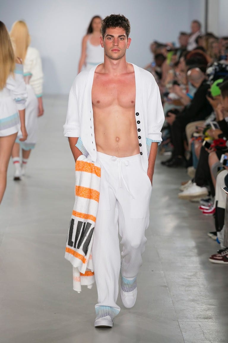 Crisp white floral crochet knits revealed bronze skin beneath and the covetable glow of the models was provided by Sam Bryant and the M-A-C pro team. Neon Converse as well as oversized, Zig Zag, Linda Farrow glasses provided the final pop to the looks, each more fun than the last. The show was finished off by a playful “dab” courtesy of brothers Koen and Tayler Prince-Fraser, together again as a family, in true Sibling style.” – FY Magazine.es