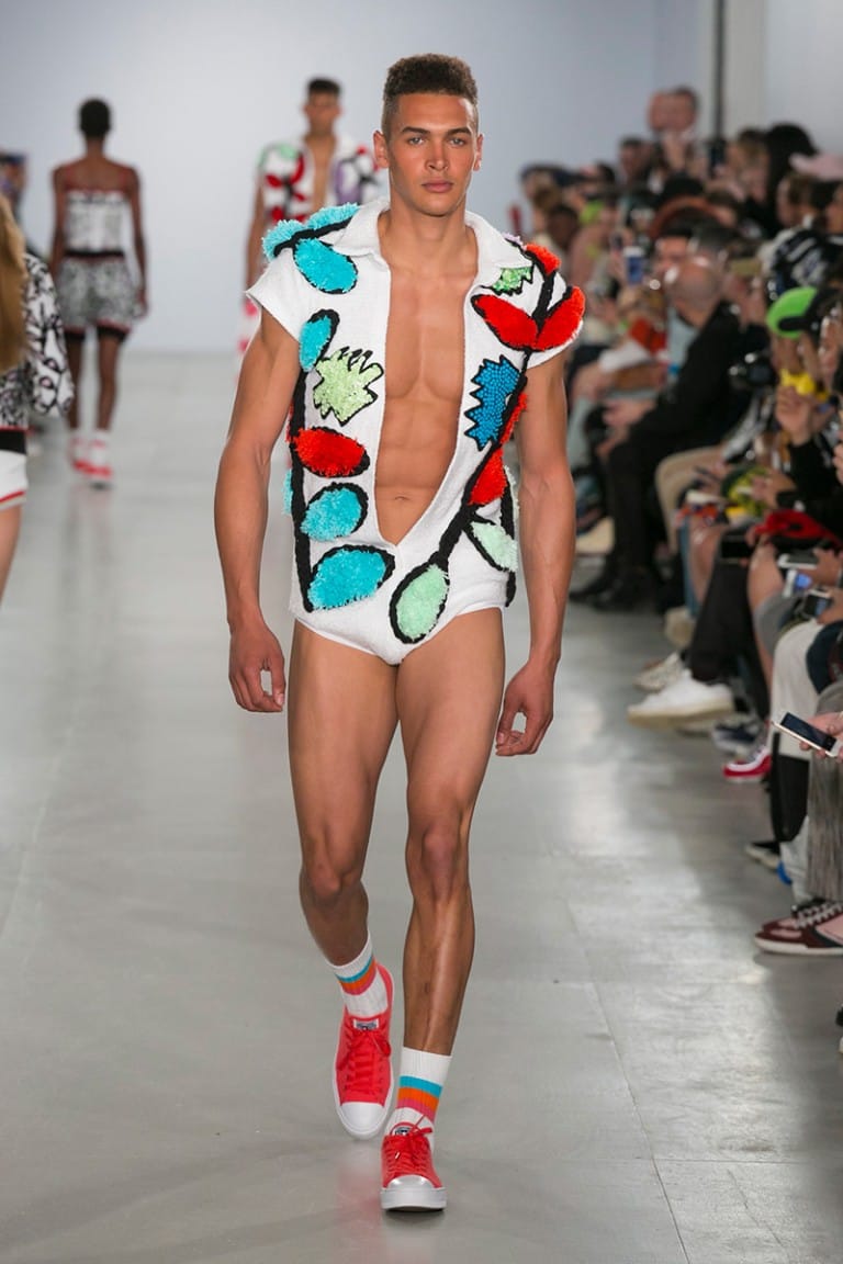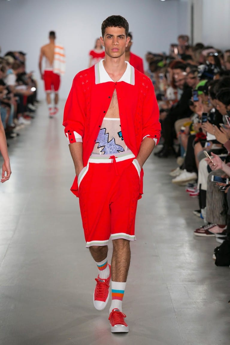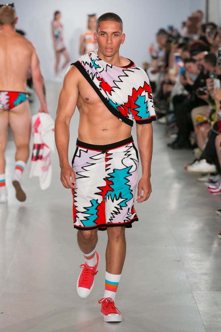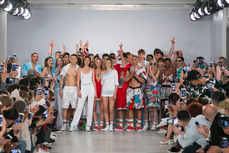 Crisp white floral crochet knits revealed bronze skin beneath and the covetable glow of the models was provided by Sam Bryant and the M-A-C pro team. Neon Converse as well as oversized, Zig Zag, Linda Farrow glasses provided the final pop to the looks, each more fun than the last. The show was finished off by a playful “dab” courtesy of brothers Koen and Tayler Prince-Fraser, together again as a family, in true Sibling style.” – FY Magazine.es