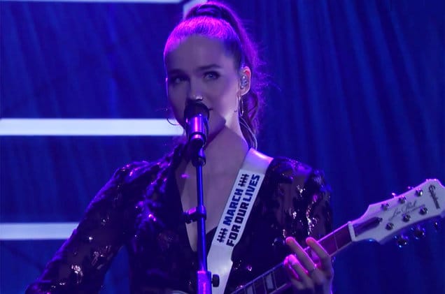 According to our sources, “Three weeks before an expected 500,000 people are scheduled to descend on Washington, D.C., to join the student activists of Parkland, Florida, to pressure Congress into strengthening the nation’s gun laws, the movement got some prime time attention from alt-pop duo Sofi Tukker on Thursday night. During their performance of new song “Baby I’m a Queen” on Conan, singer/guitarist Sophie Hawley-Weld proudly displayed a sticker promoting the March for Our Lives event on her guitar strap.”
