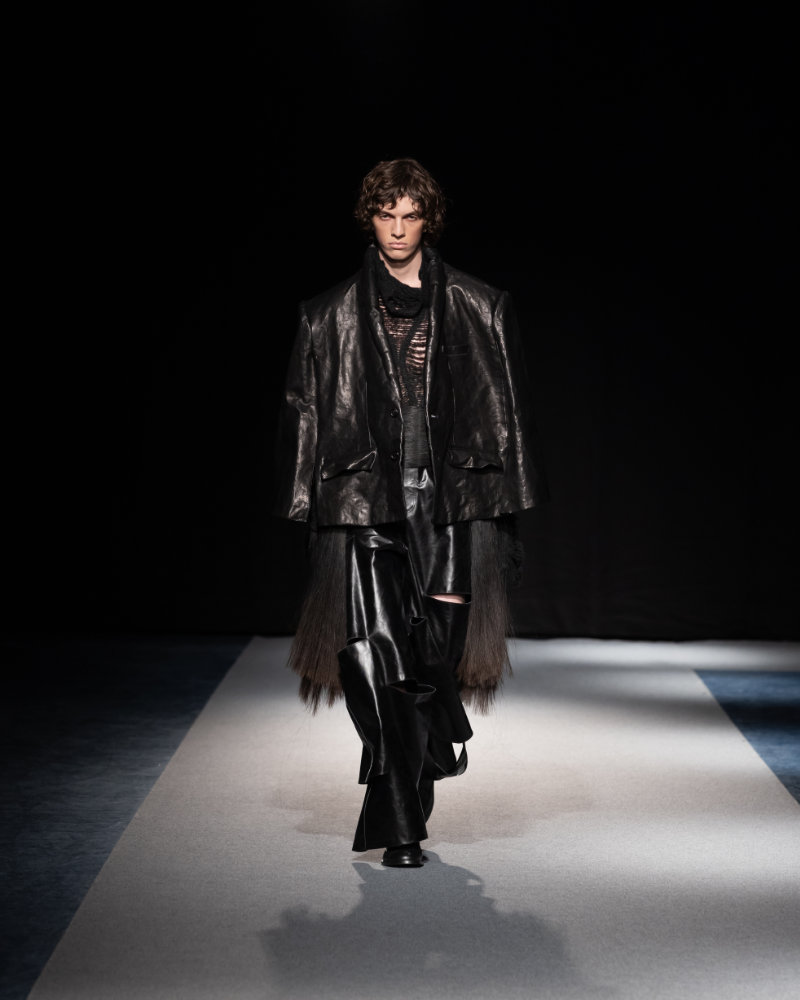 Crushed came through in the fabrics — rumpled silks, wrinkled cottons, and leather with a lived‑in sheen. Cast showed up in the silhouettes — rigid, molded shapes that felt almost armor‑like. Constructed was the through‑line — every look built with architectural precision, even when the surface looked undone.