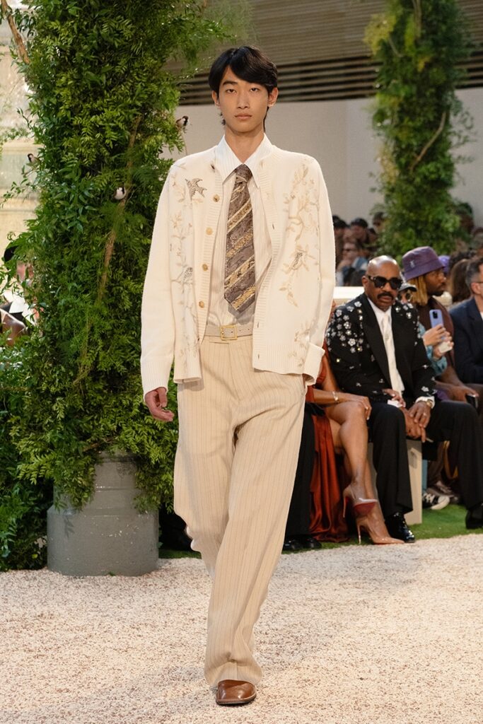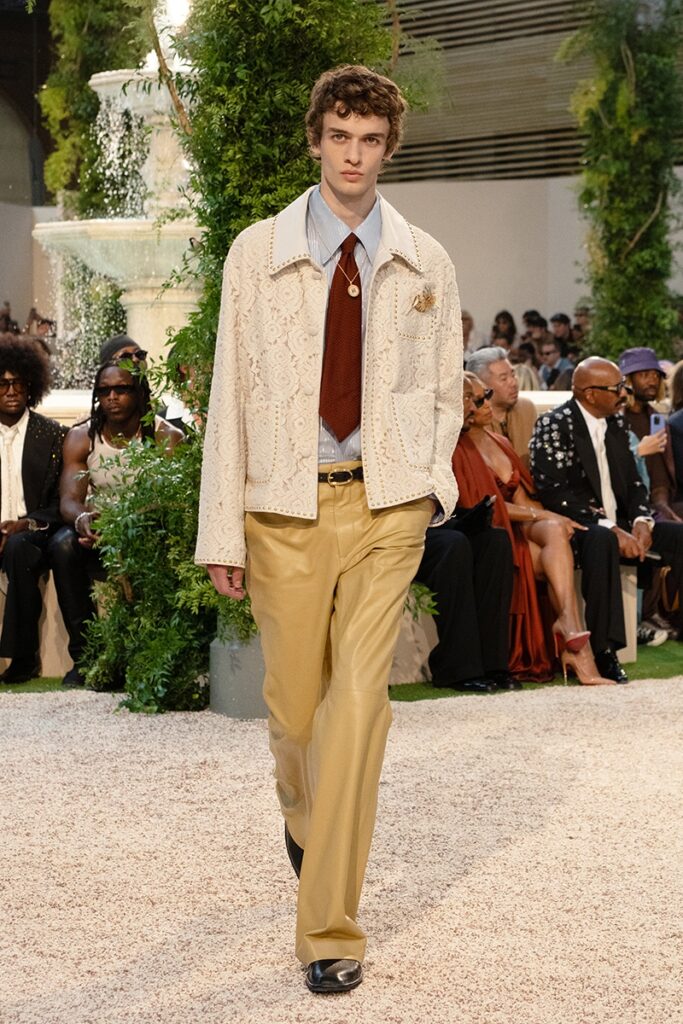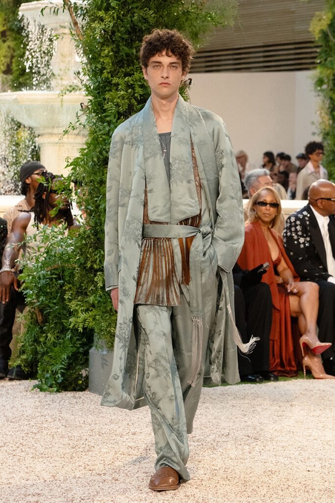 The fictional Chateau AMIRI serves as his stage, a fusion of Hollywood nostalgia and jet-set ease, transitioning from last season’s after-dark Club AMIRI to the soft glow of morning light.