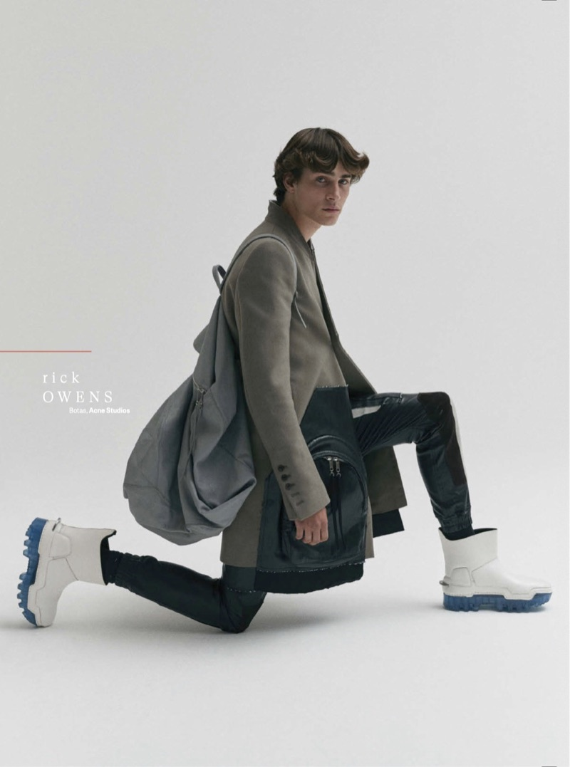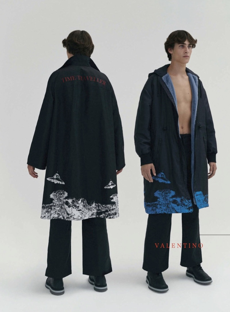 “Liam Kelly channels his inner David Bowie and looks to the future with a new editorial. Nagi Sakai photographs Liam for a GQ Style México story for the magazine’s fall-winter 2019 issue. Noting brands such as Rick Owens and Valentino, stylist Fernando Carrillo brings together quite the space-inspired wardrobe. Front and center, Liam dons everything from clunky white boots to a grey oversized Ermenegildo Zegna coat.” – TheFashionisto.com