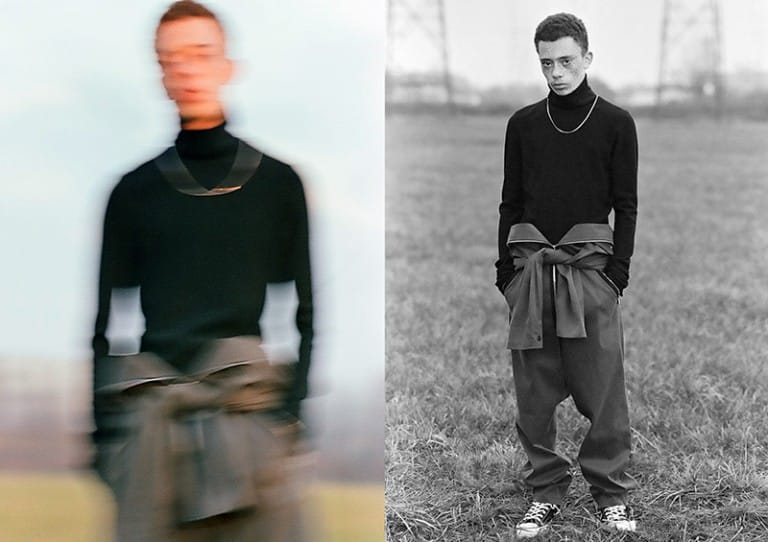 The collection showcases a modern approach to classic silhouettes, with looks consisting of loose fitting trousers paired with oversized outerwear in subdued hues. It also includes a variety of outerwear garments ranging from a bomber jacket and oversized trench to a flannel coat and workwear pieces juxtaposed with modern finishings. The garments are complemented with an assortment of details including unfinished hems, leopard print leather, reversed finishings and artisanal stitching.” – FY Magazine.es