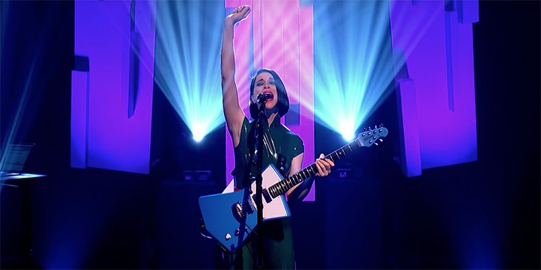 Recently sharing a reworked version of the classic album Masseduction’s, “Slow Disco,” tonight, she unveiled her first television live performance of “Fast Slow Disco”. It’s all that and a treasure trove of ice cold gold. In her signature sexy smoldering charm, scope out thee inimitable rock n roll goddess St.Vincent as she struts her fast slow disco right below!