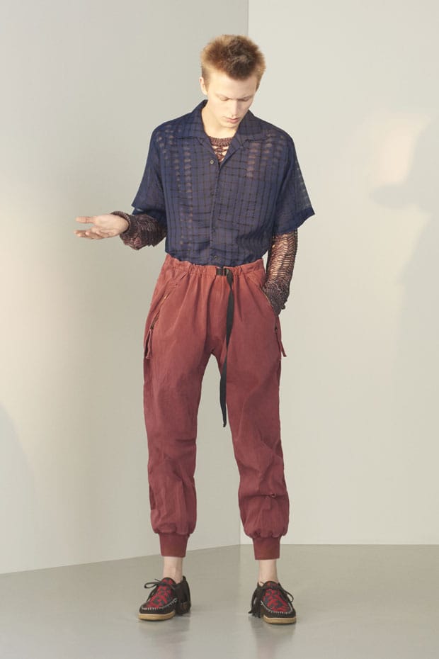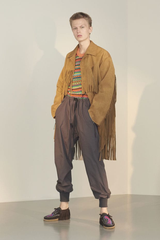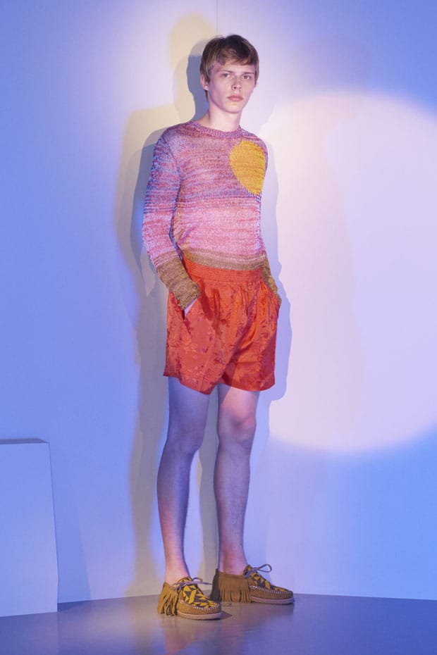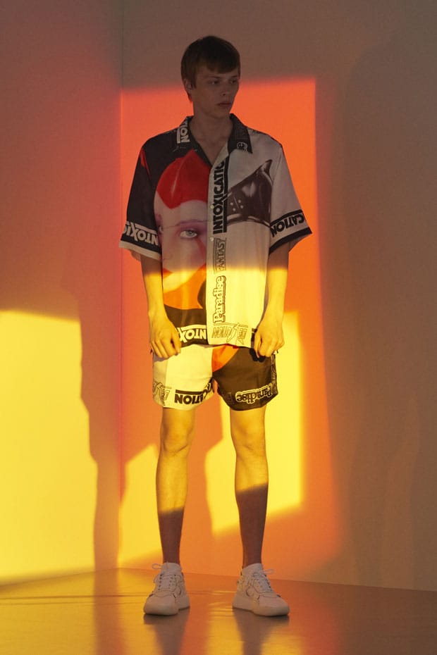 Tropical prints embrace the spirit of summer featuring scenes of volcanoes, palm trees, hibiscus flowers and birds of paradise on boxy retro shirting, bombers and t-shirts. A subtle English rose appears on silky jacquard shirts in apple green and chilli red. Multi-coloured pictorial knits feature sunsets and mouline skylines. Elsewhere fairisle tank tops come in neon colours. Romance and nostalgia of travel are explored on jackets and shirts emblazoned with a map of the Balearic Islands and a volcanic island scene brings to life shirting and trousers. Escapism wordplay is spelt out with striking words ‘fantasy’, ‘paradise’, ‘euphoria’, ‘desire’ and ‘infatuation’ which are printed, embroidered or hot fixed across the collection inspired by beaded bracelets from Mediterranean coastal towns. – from Stella McCartney