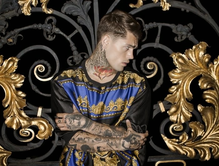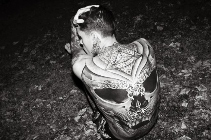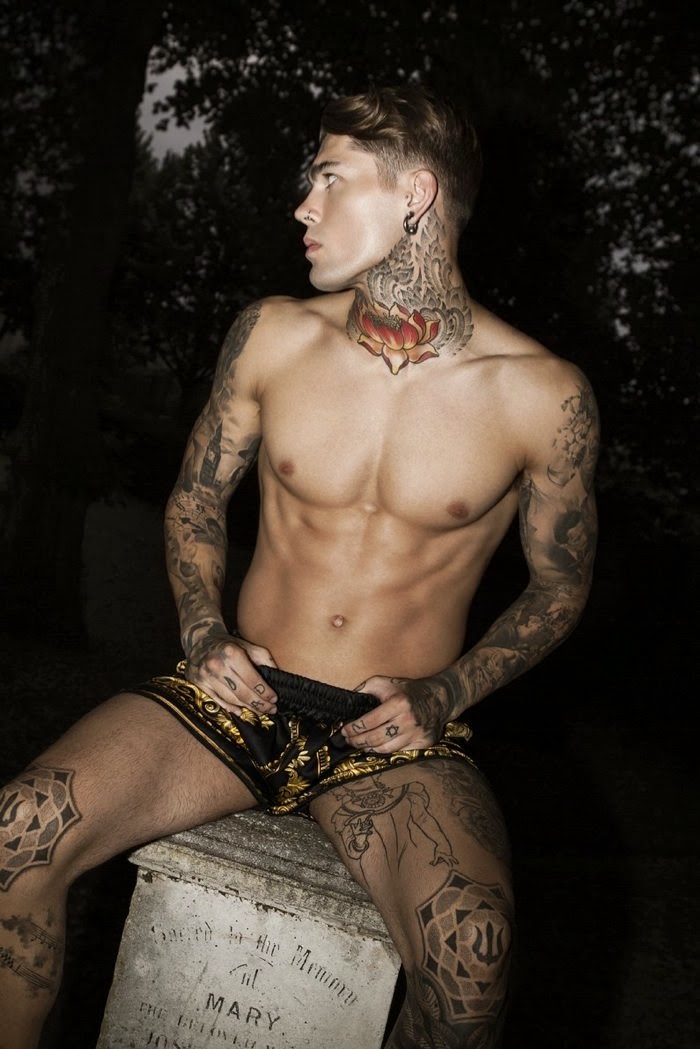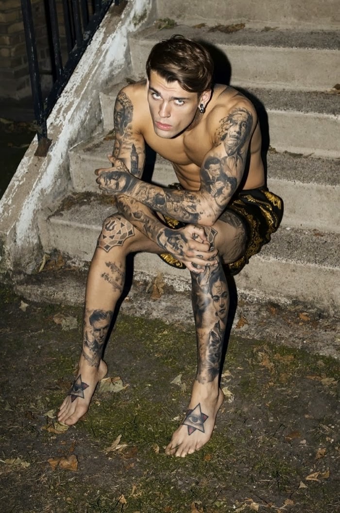 Tattoos on Display–Designer Theodore Leventakis joins creative forces with photographer Antonis Delta to style British model Stephen James in a story for Risbel magazine. Complemented by the designs of Leventakis, Stephen poses for striking images that show off his many tattoos and piercings. Courtesy of – thefashionisto.com