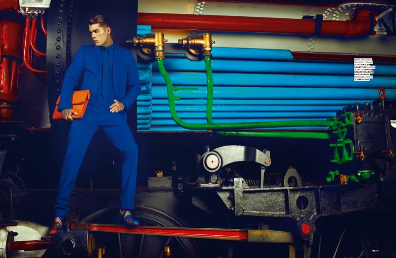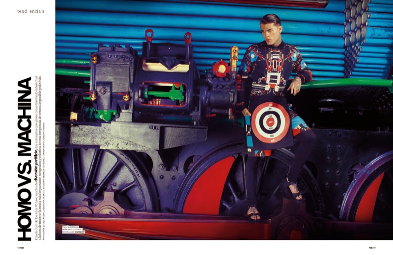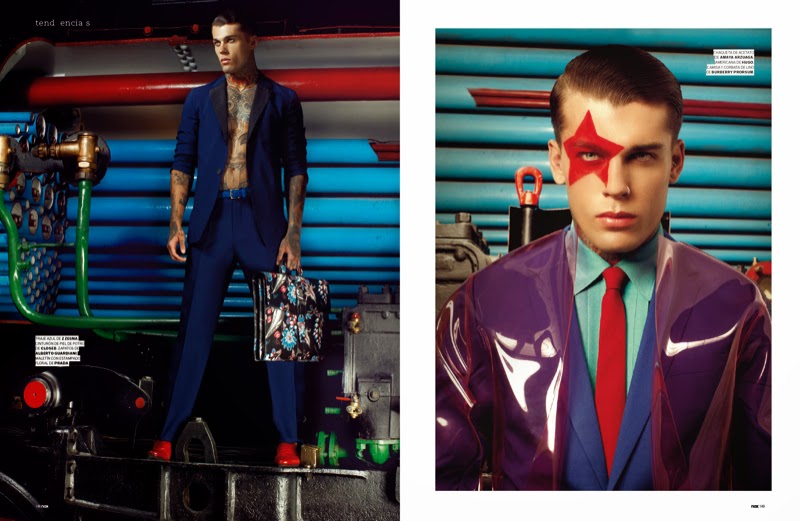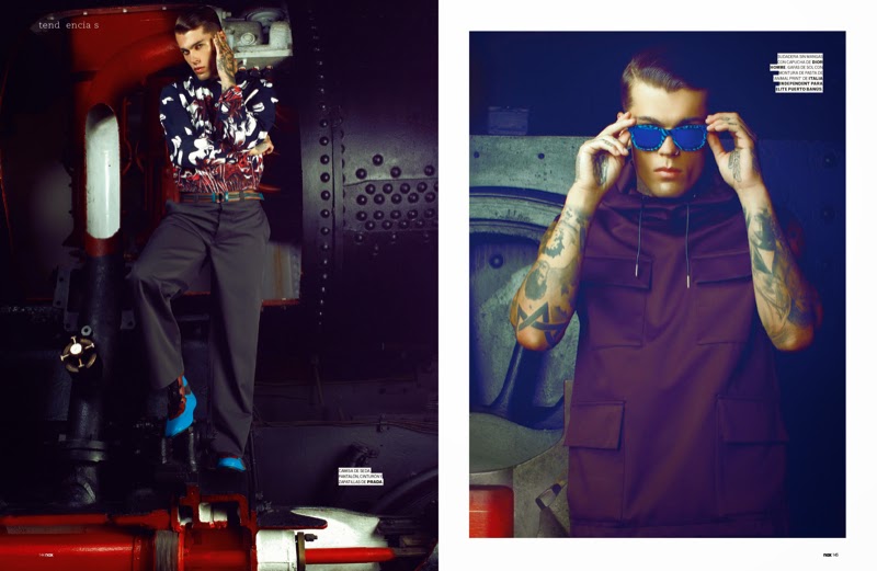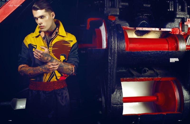 Lick It Up! Channeling KISS, British model Stephen James taps into his wild side for the latest cover story of Spanish magazine Nox. For the electric story featuring summer fashions, Stephen connects with photographer Juanjo Molina and fashion editor Abraham Gutierrez. The results are mesmerizing as the editorial unfolds with a man vs machine theme, featuring fashions from Givenchy, Prada, Philipp Plein and other labels. In addition to gracing the cover of Nox, Stephen also appears in ck One’s newest campaign. / Art direction by Abraham Gutierrez. Coordination by Alberto Garrido. Grooming by Antonio Estrada using Redken and M.A.C. Cosmetics. Photo assistance by Eduardo Navarro. Style and art assistance by Lola García.” – The Fashionisto