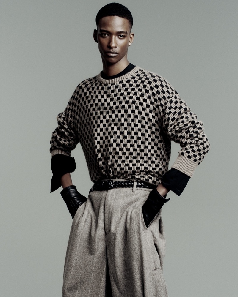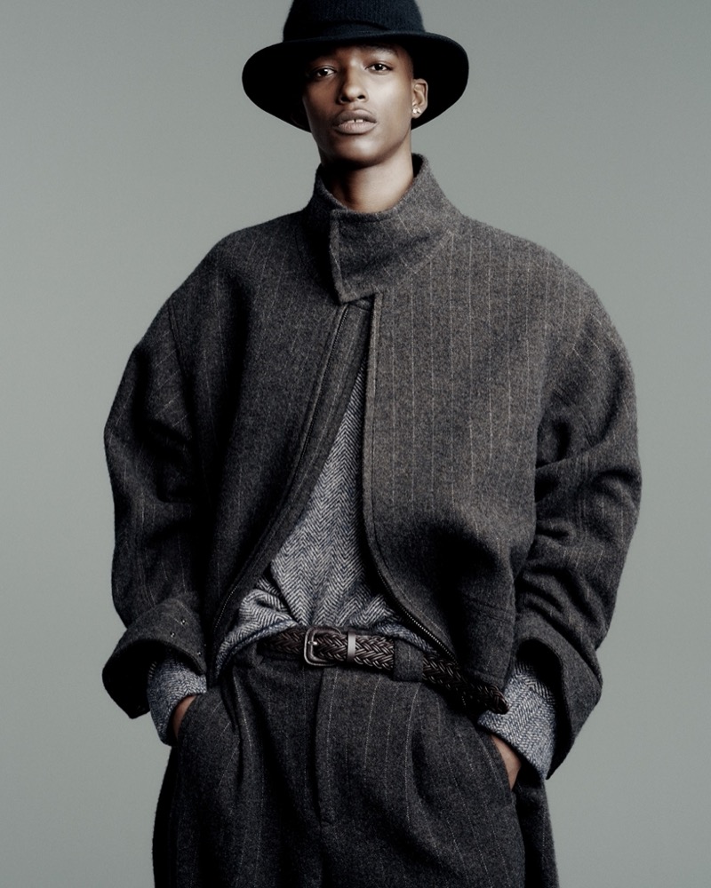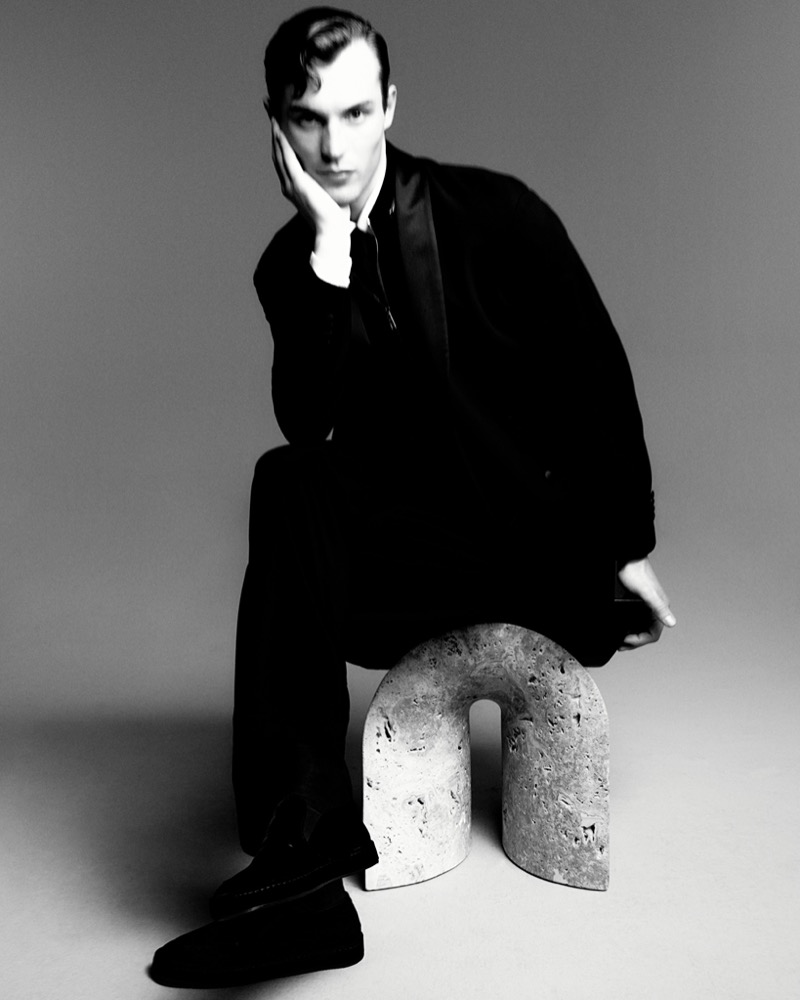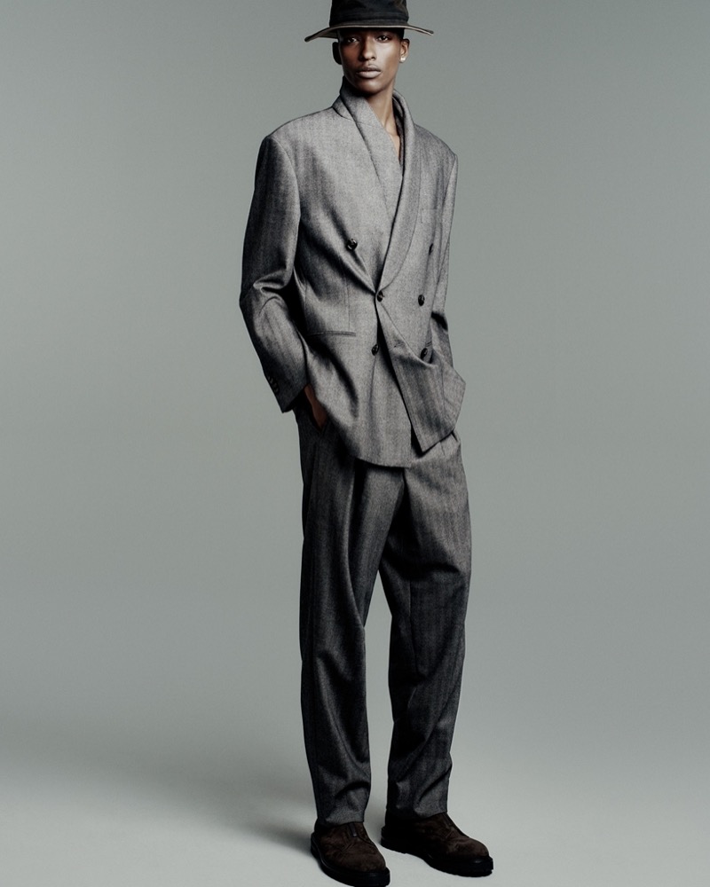 Where fellow smoldering face, model Samuel Elie, dons a double-breasted suit from the same collection—tailored to perfection, radiating timeless cool.