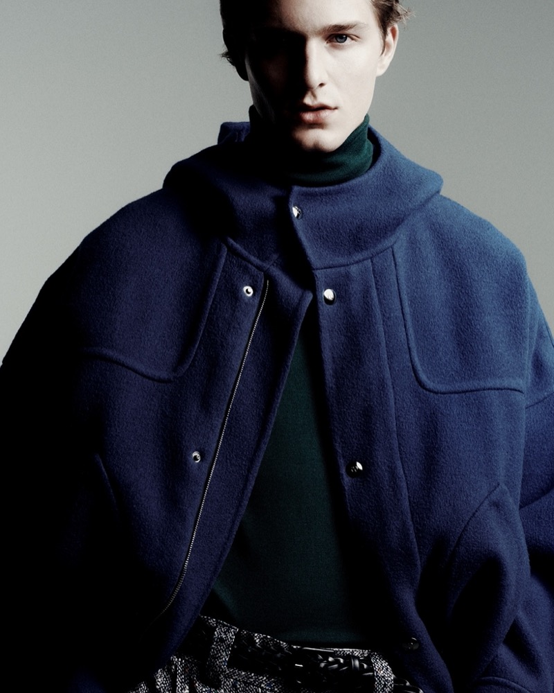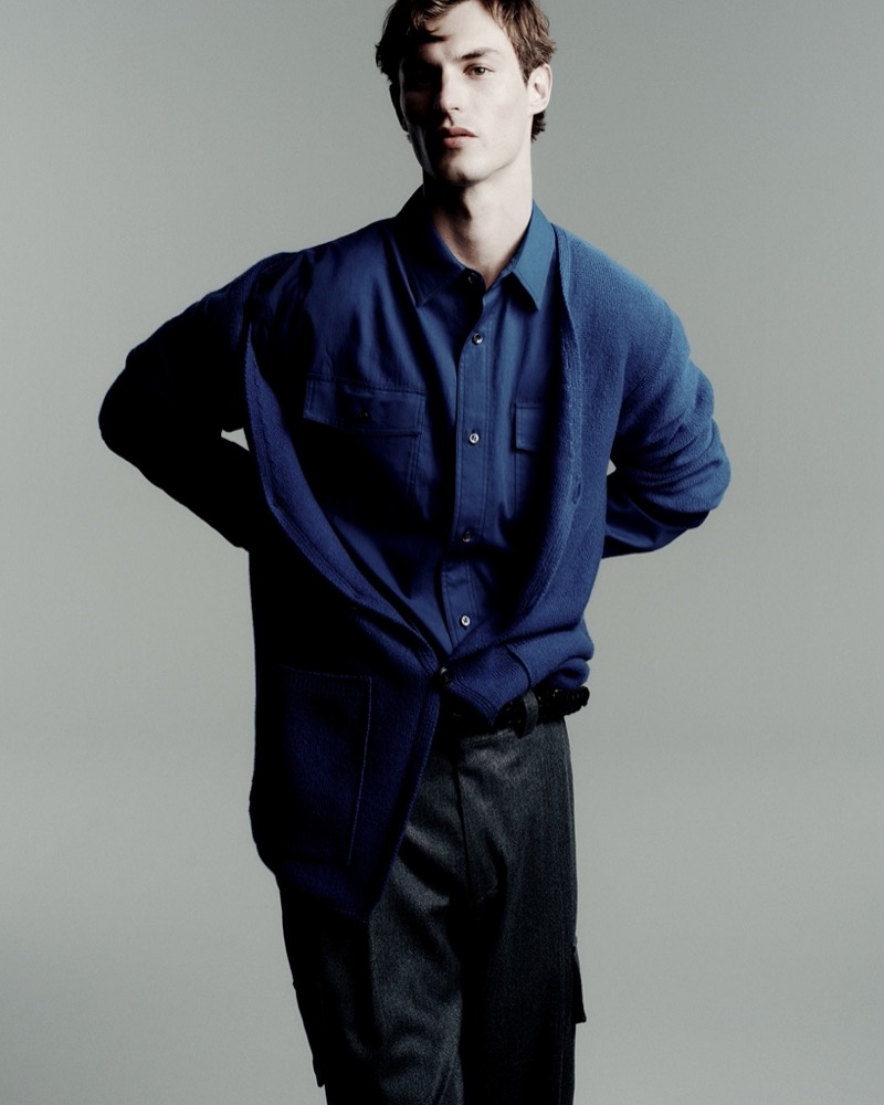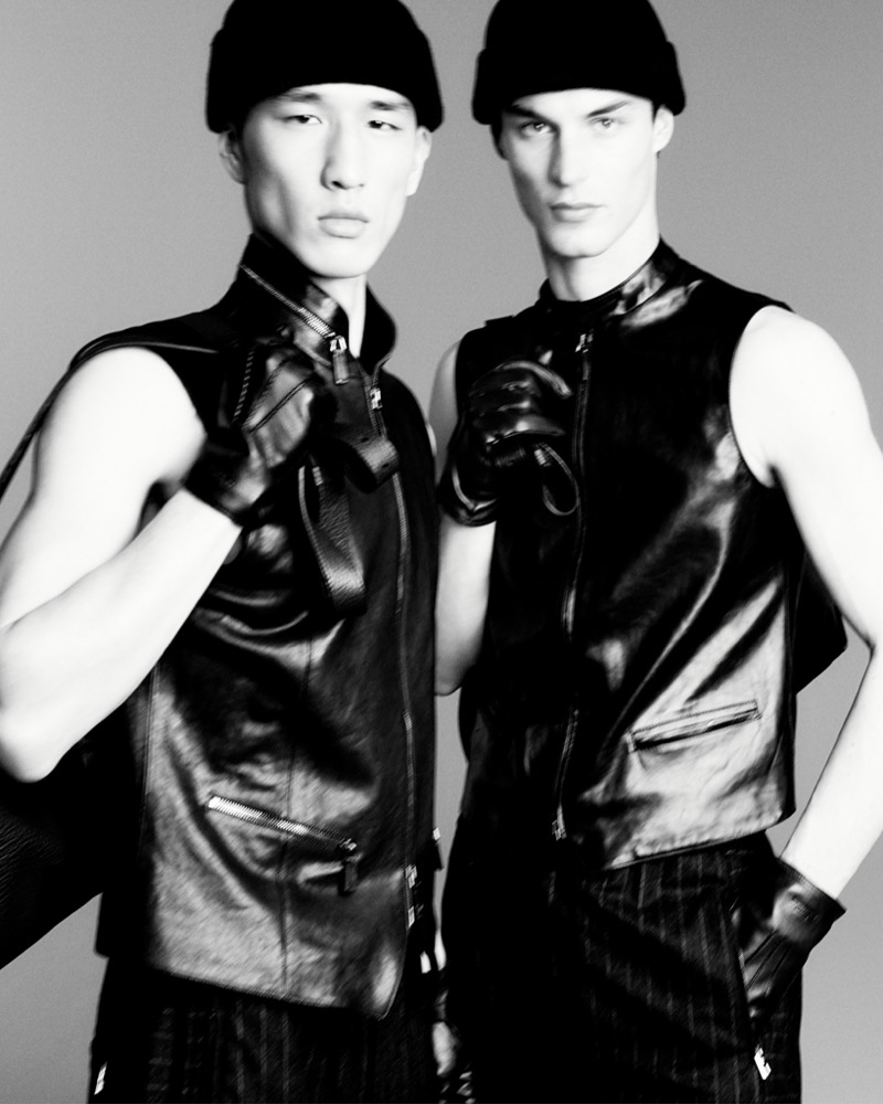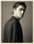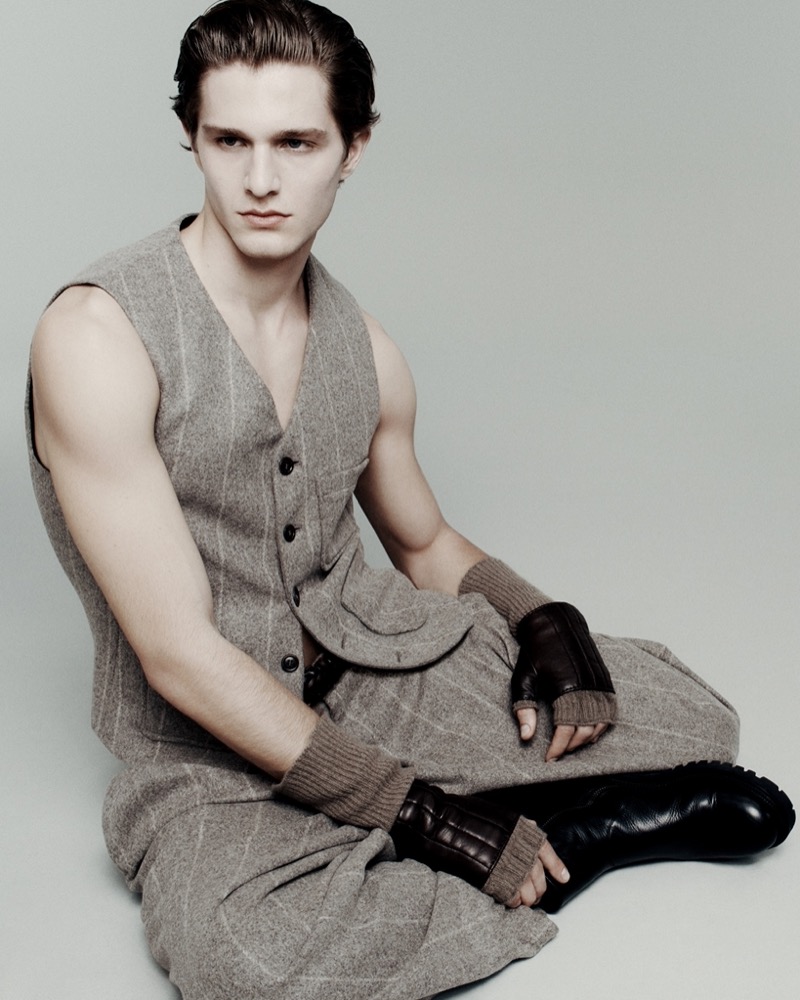Where fellow smoldering face, model Samuel Elie, dons a double-breasted suit from the same collection—tailored to perfection, radiating timeless cool.