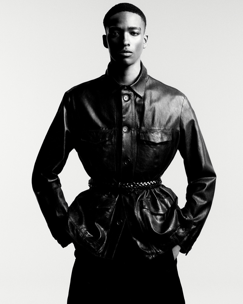 Kit Butler struts sleek leather threads from Giorgio Armani’s Fall-Winter 2025 collection, serving face and form with that signature high-fashion ease.