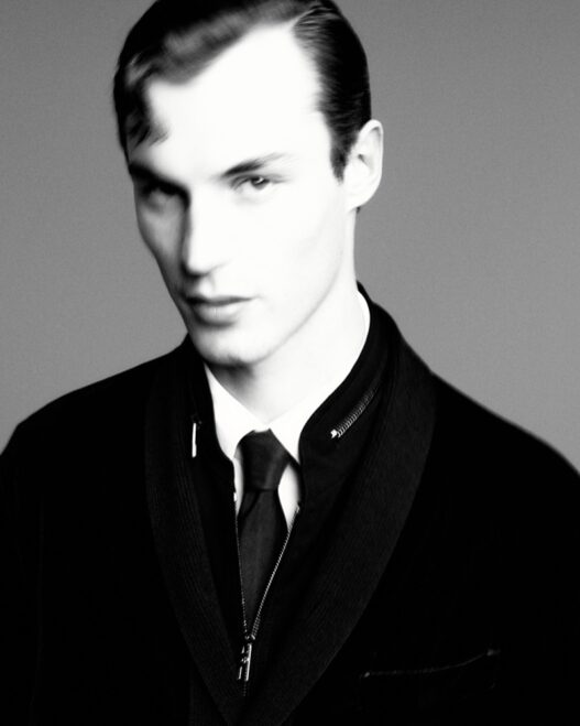 Where fellow smoldering face, model Samuel Elie, dons a double-breasted suit from the same collection—tailored to perfection, radiating timeless cool.