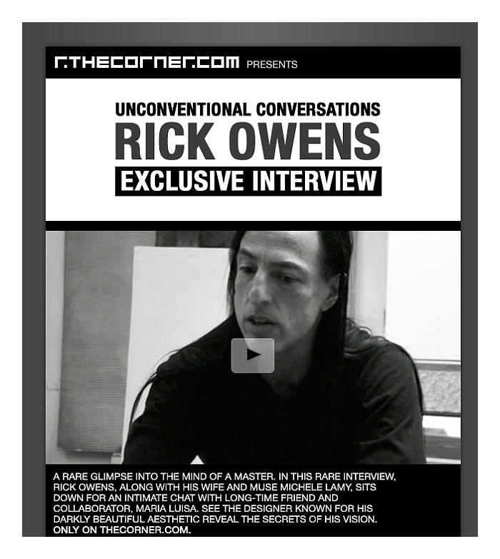 Rick Owens sits down for an interview with Maria Luisa for The Corner. Owens talks about his initial move to Europe and his gravitation towards dark colors…