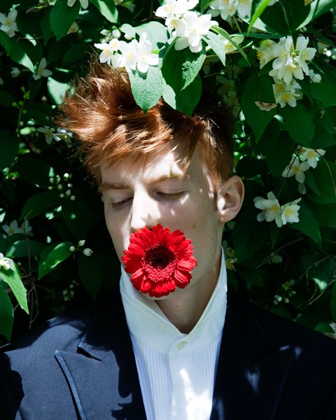 Bastien Bonizec and Thomas Legros star in this wonderful floral editorial by Sabine Villiard for Prestige magazine with makeup by Jabe Vincent. Courtesy of – Homotography