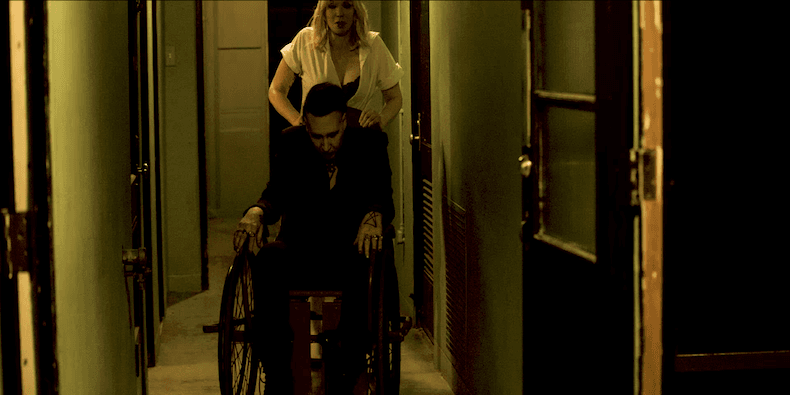 In a perfect setting for the duo, Miss Love plays nurse, and her role is pretty much pushing Marilyn in his wheelchair through the hallways of an asylum. Did we not say impeccable setting?