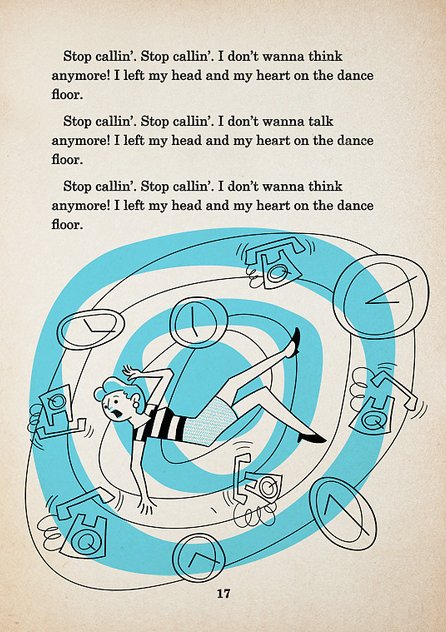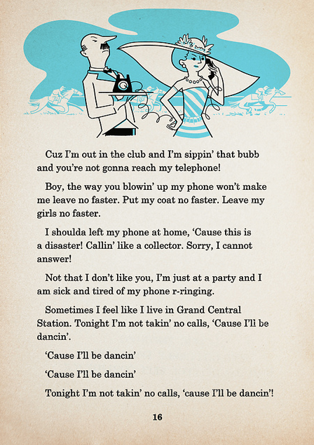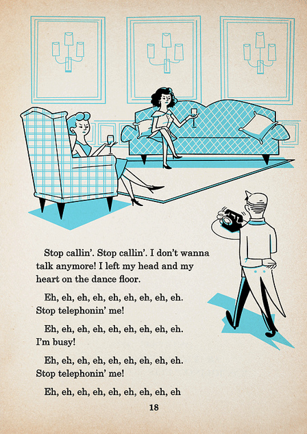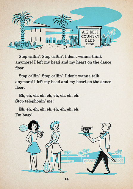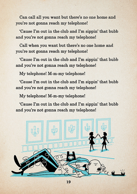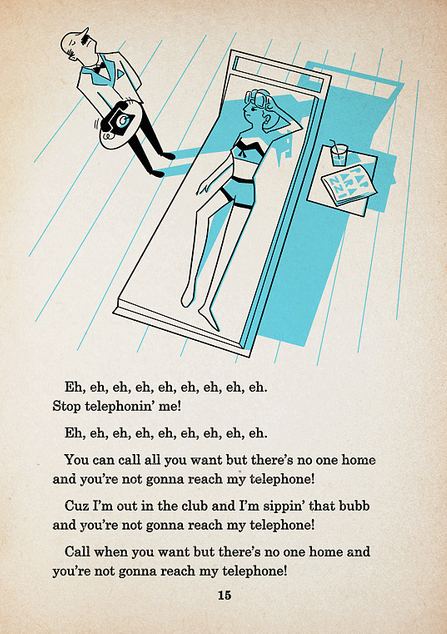 Retro inspired artist Andrew Kolb illustrates the lyrics for Lady Gaga‘s ‘Telephone’ in a spread that should be binded and put on the book shelf at all elementary schools world wide. Let the new grade school sing along begin!