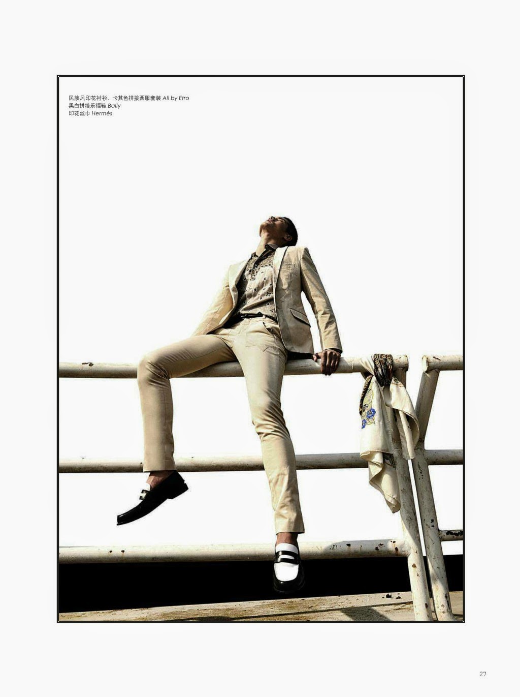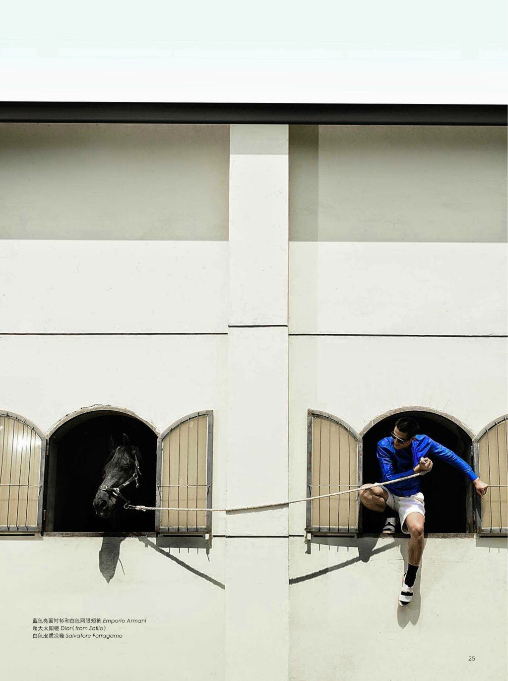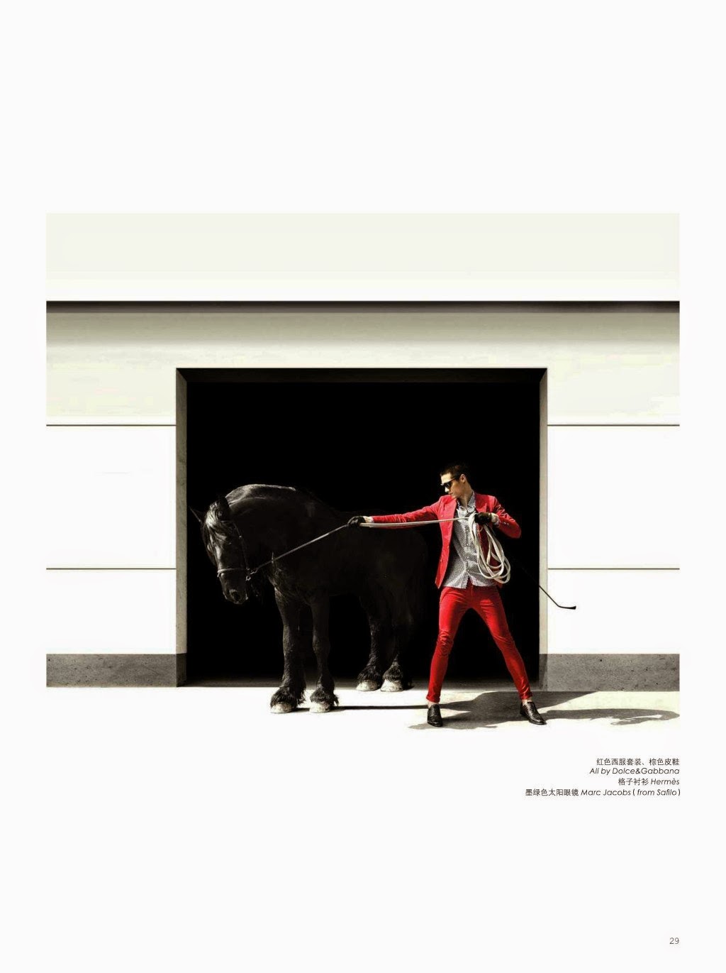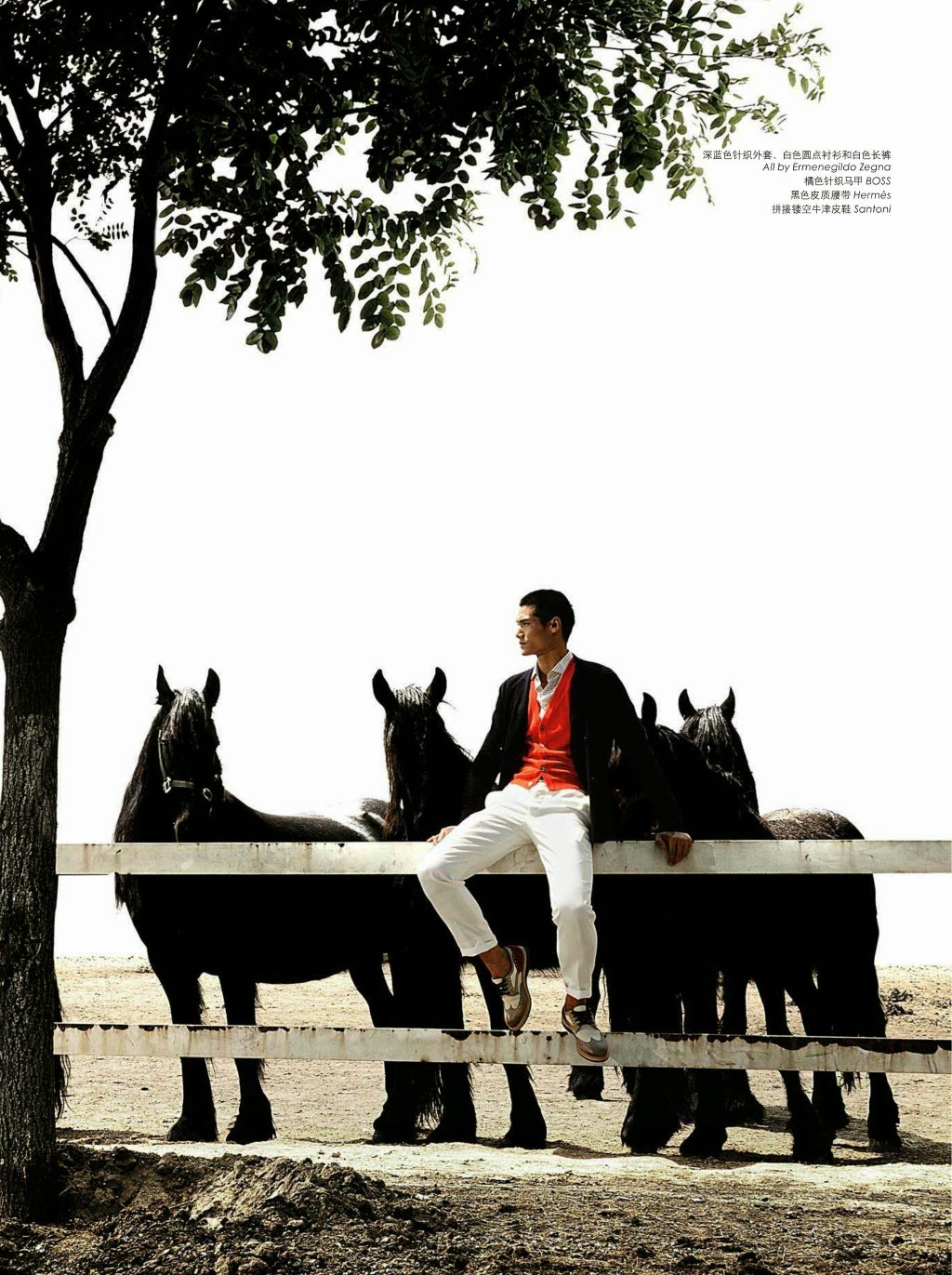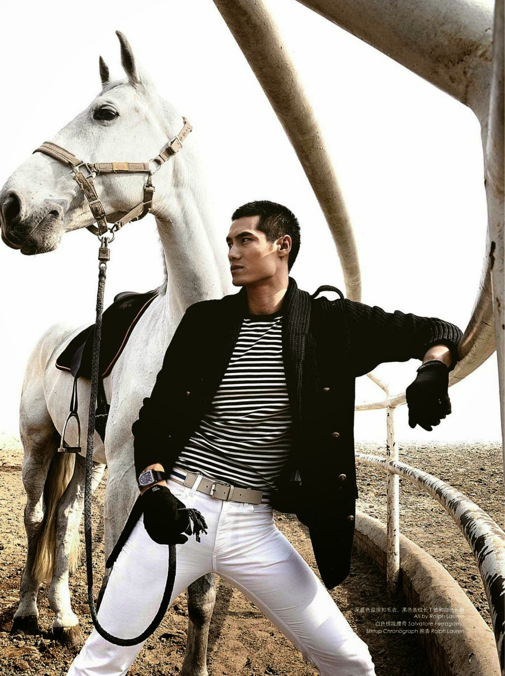 “The Conquest of the Game–Photographed for the May edition of Fashion Weekly, model Hao Yun Xiang delivers a stunning story as he poses as a jockey with horses. Donning clean slim lines, Hao hits sharp angles as he provides contemporary fashion options for the on-trend man of style. From Dolce & Gabbana and Etro to Dior Homme, garments come together with slim-cuts and a great use of color.” – The Fashionisto