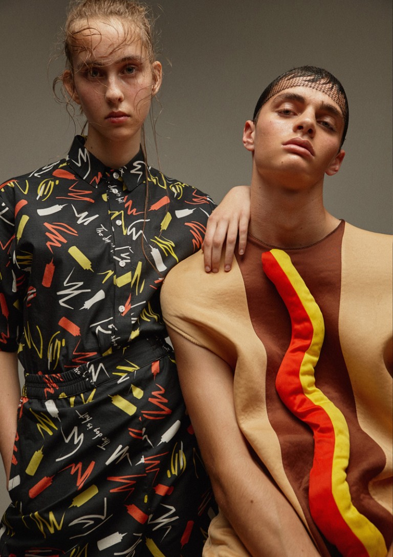 “Spanish designer Krizia Robustella has no limits! This time presents a new capsule collection in collaboration with artist Lauro Samblás to create amazing uniforms for THE DOG IS HOT, a chain of Hot Dog restaurants. Ketchup and mustard explosion where aesthetics fast food becomes a source of inspiration captured by Carlos Montilla.