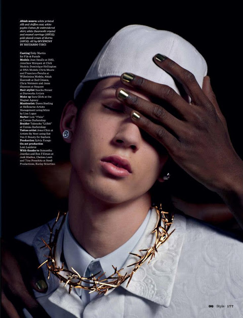 The Spring/Summer 2013 issue of British GQ Style presents The Gospel According to Givenchy with their story “nuthin’ but a ‘g’ thang”, photographed by Matthew Stone and styled by Matthew Josephs with models Abiah Hostvedt, Jonathan Marquez, Chris Moore, Christopher Wetmore, Dominique Hollington, Francisco Peralta and Joan Smalls. Courtesy of – Homotography