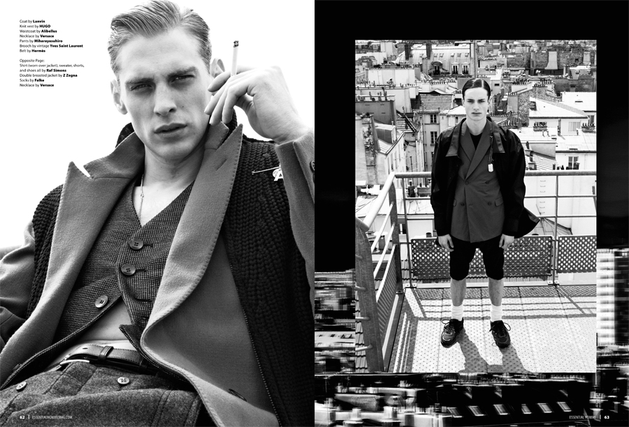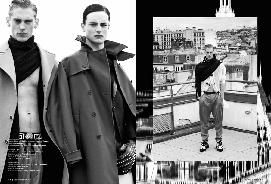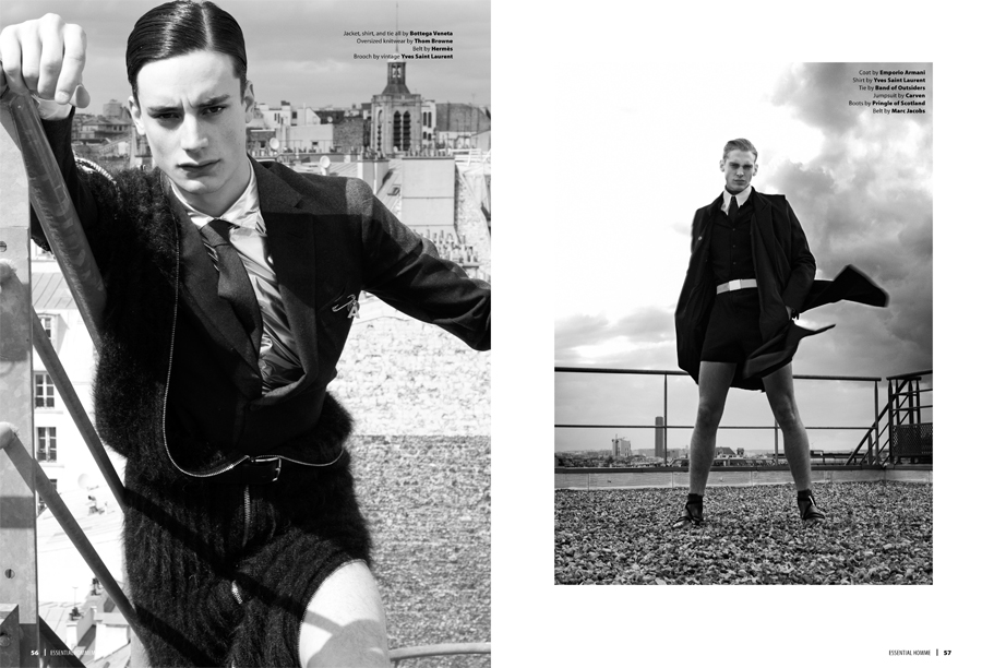 Ivan Muselli and Nicholas Galletti work together for the July/August 2012 issue of Essential Homme. In the shoot, they capture and style Jeremy Dufour and Thomas Burkovatz in a stunningly dark and haunting rooftop shoot overlooking a stunning vista of Paris featuring dramatic light and equally dramatic fashions. Courtesy of – hommemodel.blogspot.com