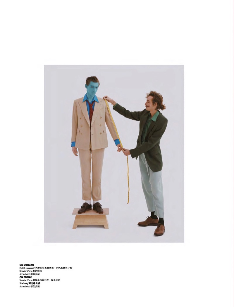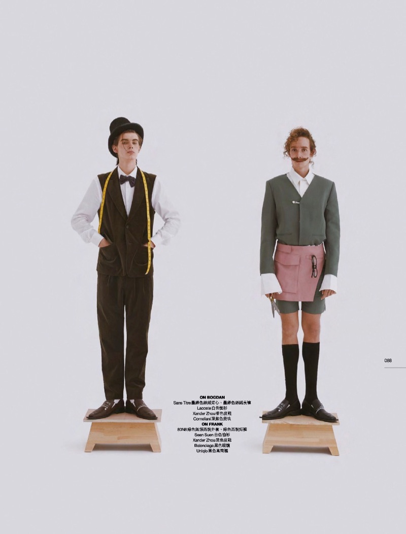 “Models Frank Plata and Bogdan P. come together for an editorial in the April 2019 issue of Men’s Uno Hong Kong. The models take up the profession of tailors for the outing. Presenting a quirky front, the pair takes to the studio in preppy styles. Frank and Bogdan sport waistcoats, trousers, tailored shorts, suit jackets, and more. Their wardrobe includes designer brands such as Corneliani, Dsquared2, and Balenciaga.” – TheFashionisto.com