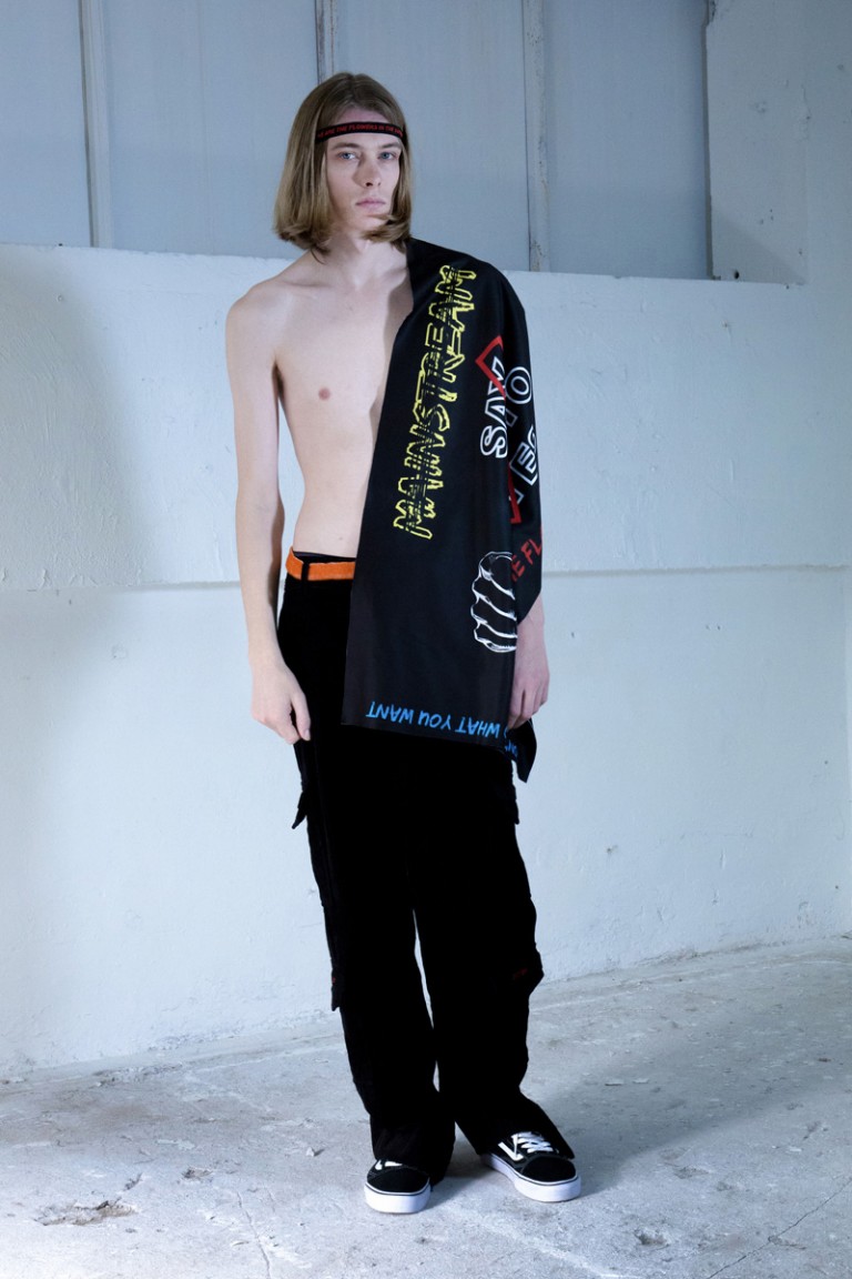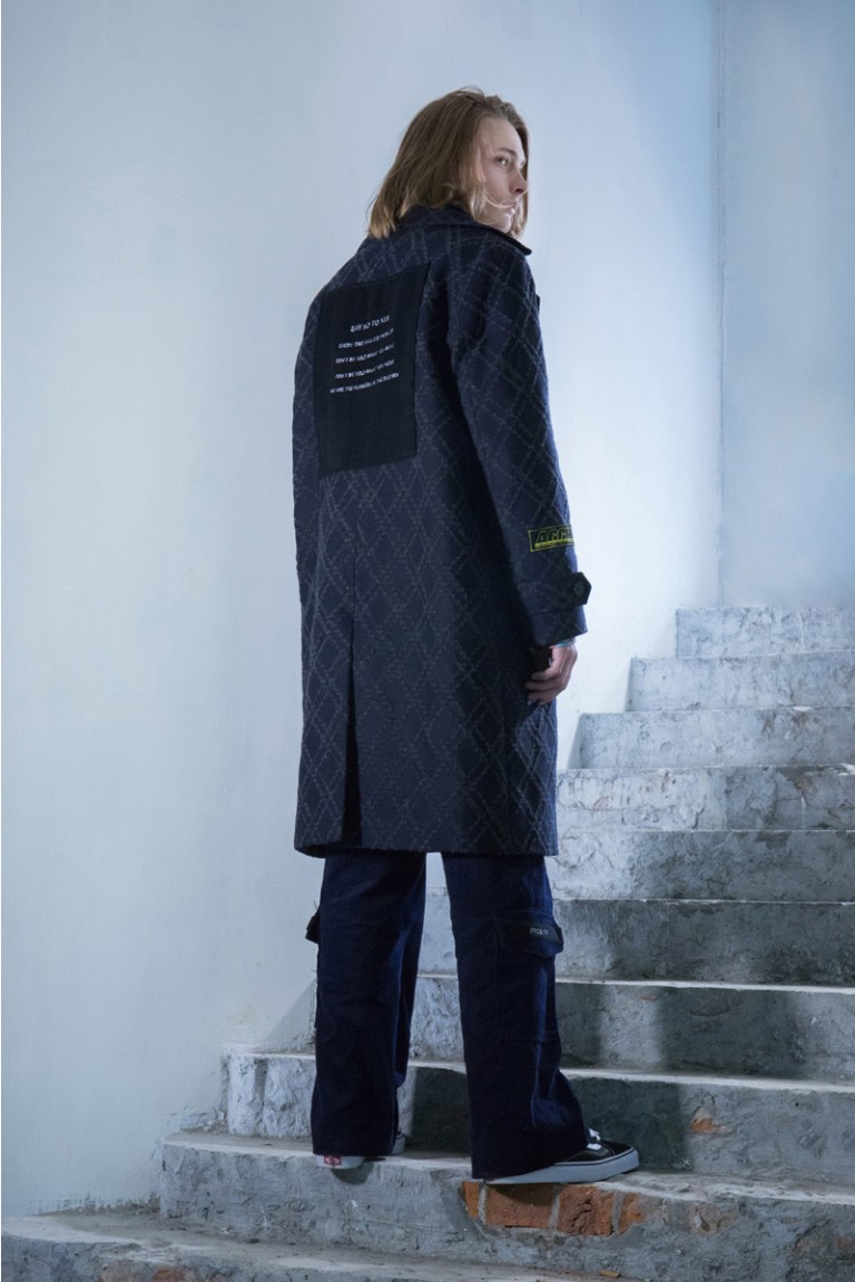 Throughout the whole collection, slogans and statements in both embroidery and prints like SAY NO TO YES and Don’t Be Told What You Want, have been used to voice out the key messages. Cross-out patches are used as a key detail. The choice of dark tone colors as main colors is to create a rather gloomy and depressing atmosphere. Yet with small details in highlighting colors; such as the use of red thread stitches helps to highlight the collection. The fabric selection mainly comes from Italy, France and Japan.