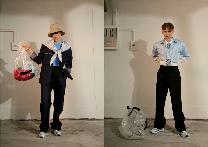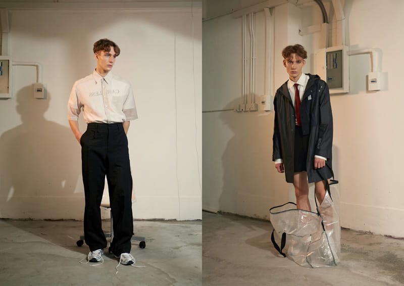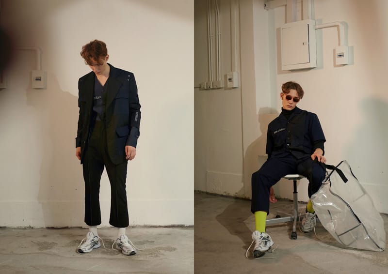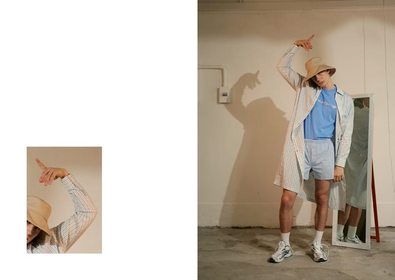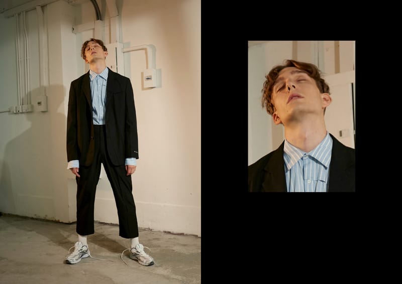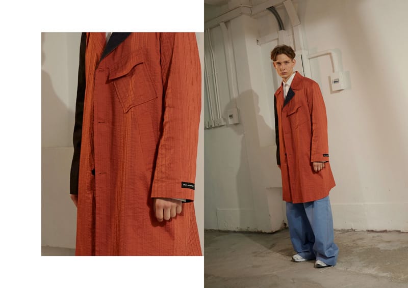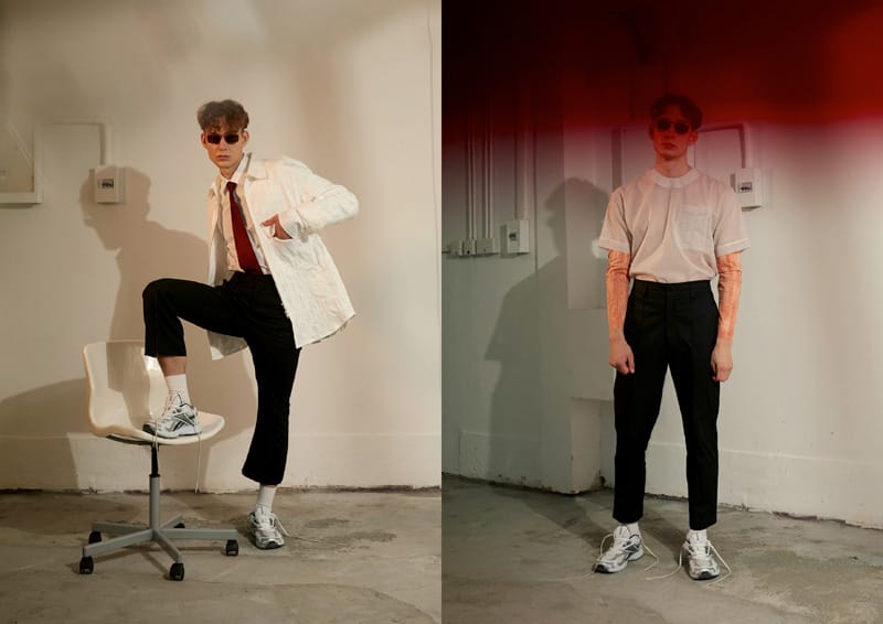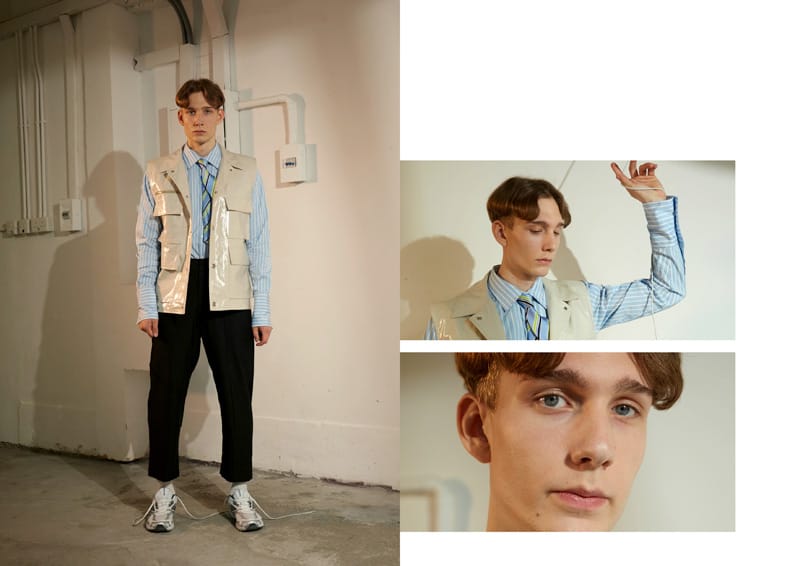 Fold details are used throughout the whole collection, such as shirts, blazer, and pockets. The detail is inspired by people who had carelessly folded their clothes up on the street without aware of it. Crinkle fabric, pleated fabric as well as some jacquard fabric that creates an illusion of wrinkle effect have been selected in the collection. Details such as exposed facing, inner pockets; overlock stitching and extended lining suggest that the clothing have seems to be worn inside out to present a carefree attitude for the whole collection.