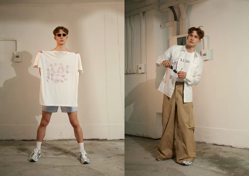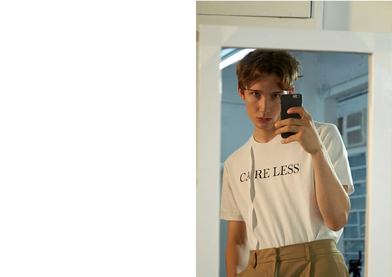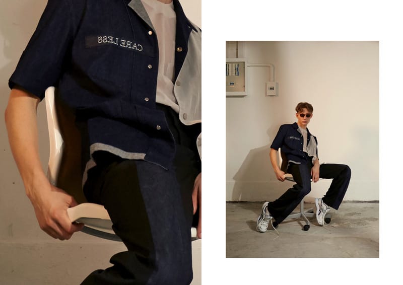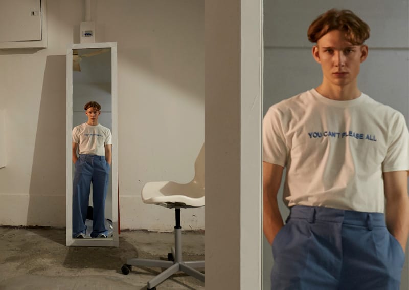 Slogans have been flipped horizontally in the collection; which can only be seen correctly through the mirror. Such as the YOU CAN’T PLEASE ALL tee and the CARE LESS fold tee; it acts as a conversation and a reminder to the wearer to be their true selves.