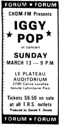 The year is 1977, Iggy Pop and David Bowie kick off a North American tour (The band consisted of Iggy Pop on vocals, David Bowie with keyboard and backing vocals amongst others) starting at Le Plateau Theatre, Montreal, Canada with still burgeoning New York band Blondie as the opening act.