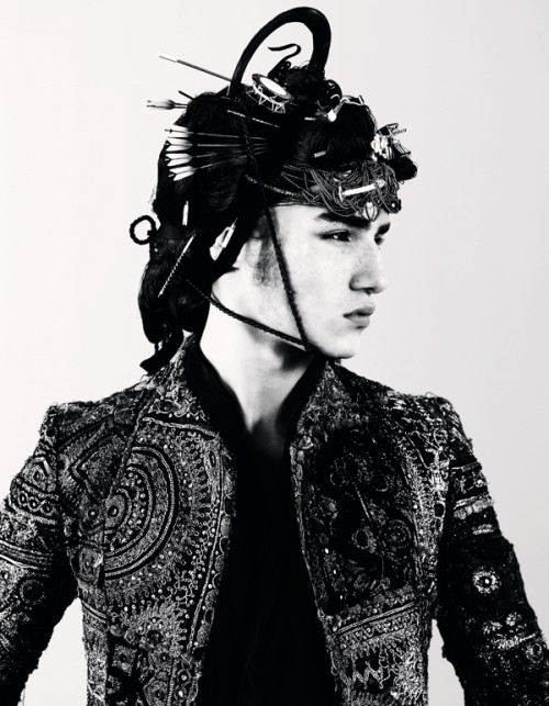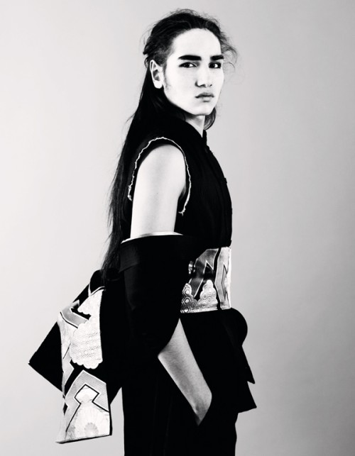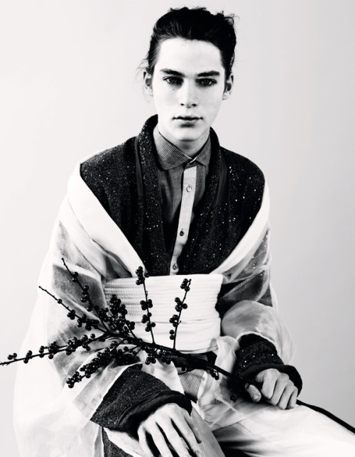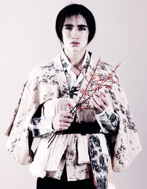 Androgyny takes an Asian turn in the January 2011 issue of Dazed & Confused with the editorial Tokyo Chorus. Male models Willy Cartier and Jaco van den Hoven join Diane in the Kimono-themed story, styled by Robbie Spencer and photographed by Ben Toms with hair & makeup by none other than Kamo Katsuya. Courtesy of – Homotography