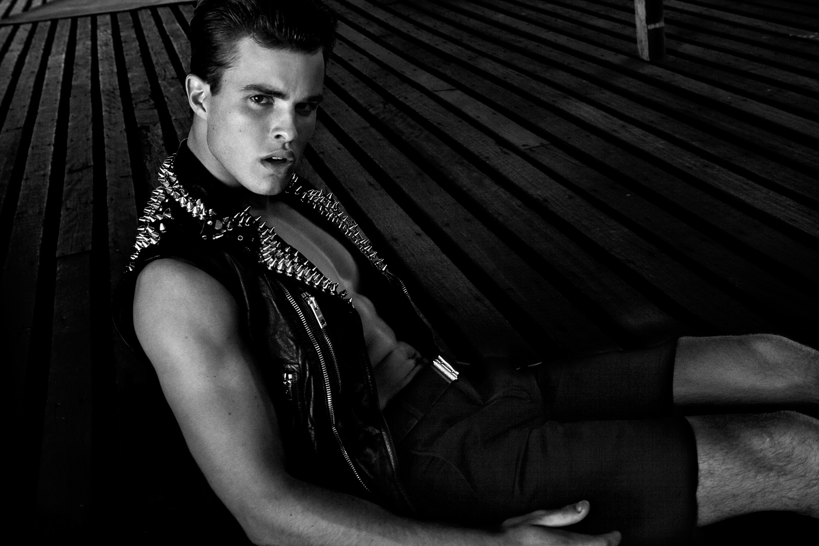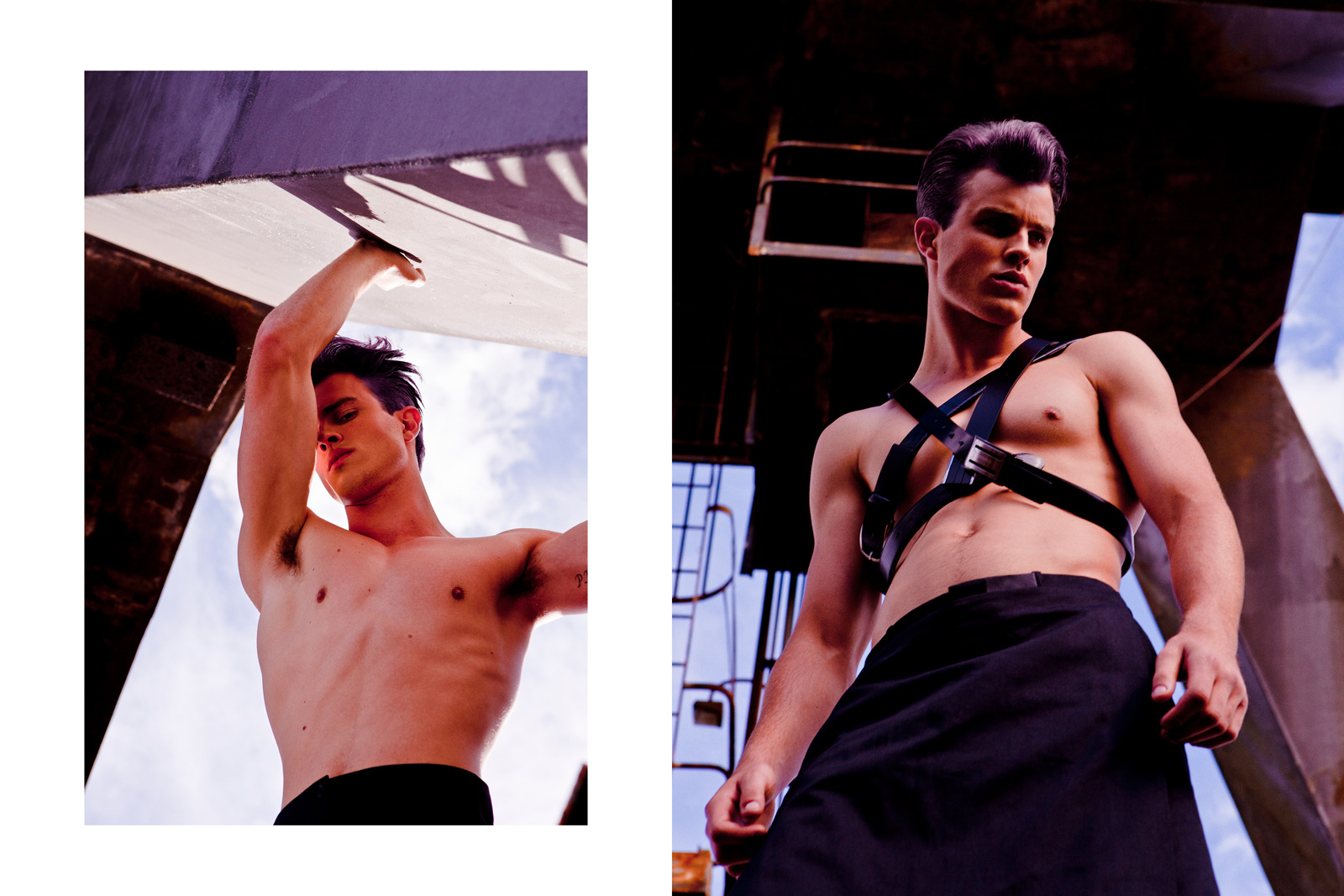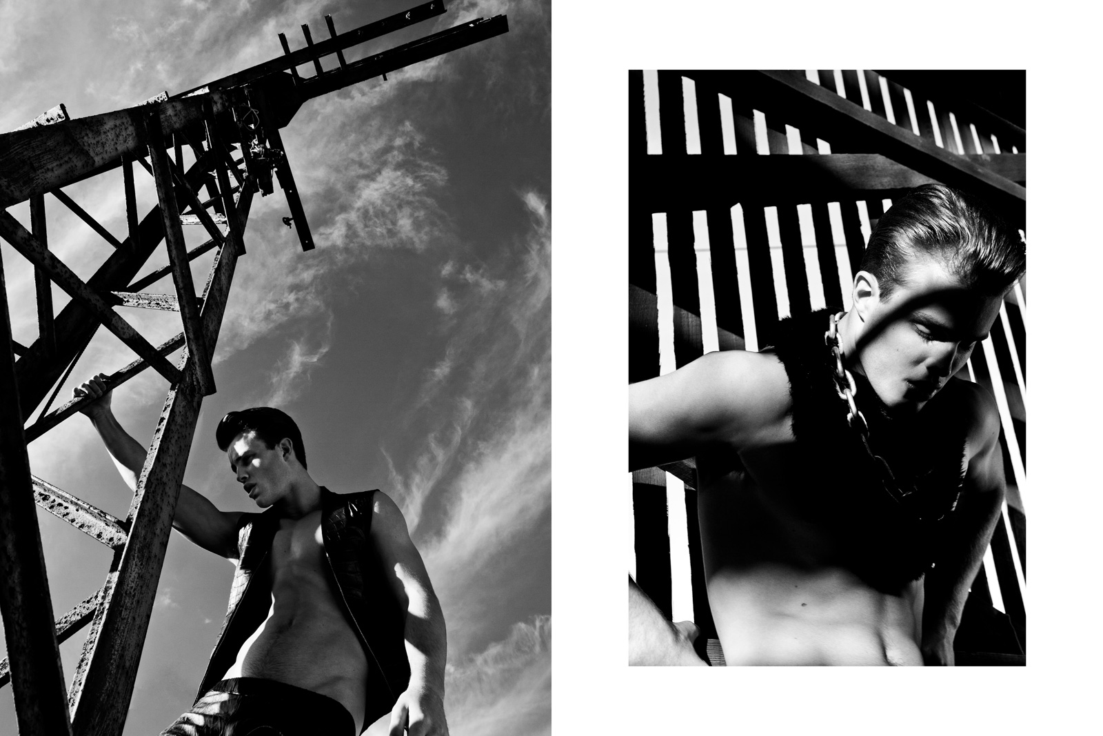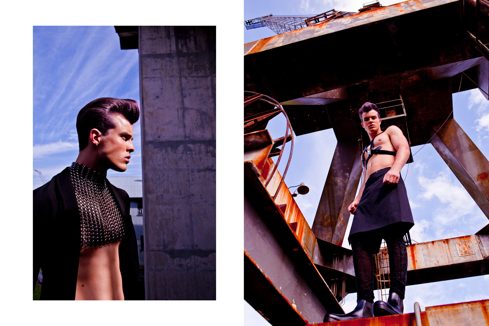 DSquared2’s Fall/Winter 2010 campaign model Jordan Coulter appears in Tangent’s latest issue in this texture-driven editorial from Emmanuel Giraud and Heather Cairns. Jordan’s strong facial structure lends to the editorial’s sharp-edged aesthetic, with hints of S&M seen on a leather harness and even some chainmail.