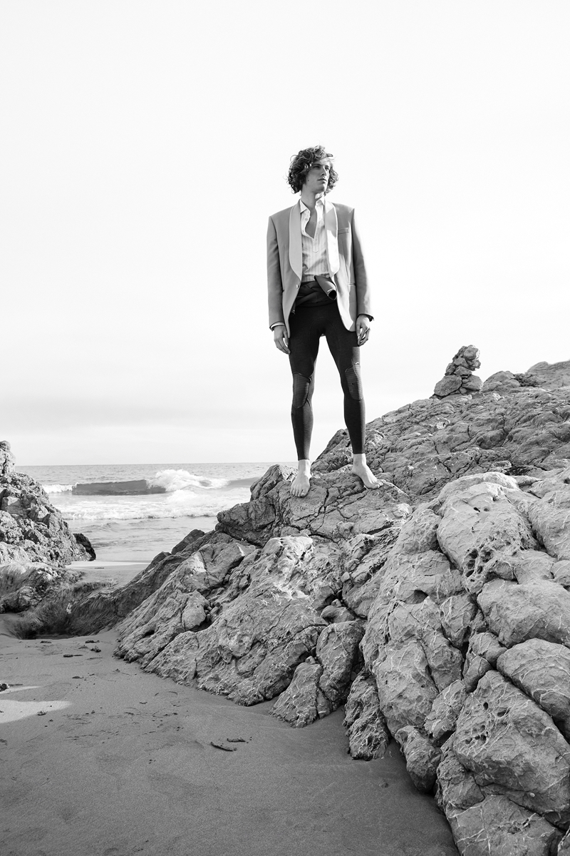 “Rocío Ramos (Lighthouse Photo Agency) collaborates with stylist Jacky Tam for a GQ China story. Models Umberto Villahermosa and Florian Kampen take to the beach for the occasion. The pair rocks wetsuits with designer fashions. Tam curates a wardrobe that features brands like Prada, Dolce & Gabbana, and Dries Van Noten.” – TheFashionisto.com