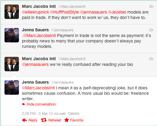 Similarly, Marc Jacobs defended their decision not to pay models; though this time, it’s on Twitter. In a tweet aimed at Jezebel, Huffington Post, and writers Jenna Sauers and Ellie Krupnick, MarcJacobsIntl wrote, “models are paid in trade. If they don’t want to work w/ us, they don’t have to.” This started a mini Twitter war between MJ and Sauers, which you can see below. MJ’s zinger refers to Sauers’ zany Twitter bio, which reads, “I used to make my living encouraging bulimia in teenage girls.”