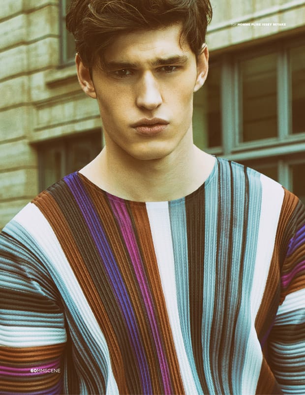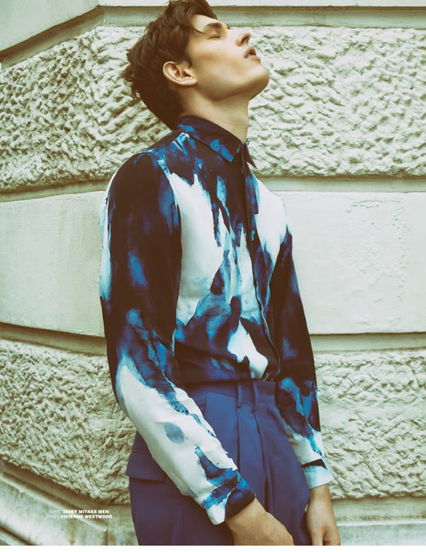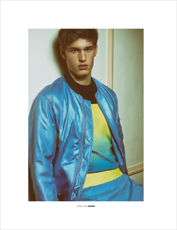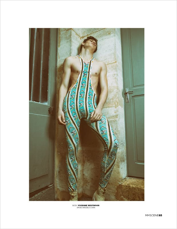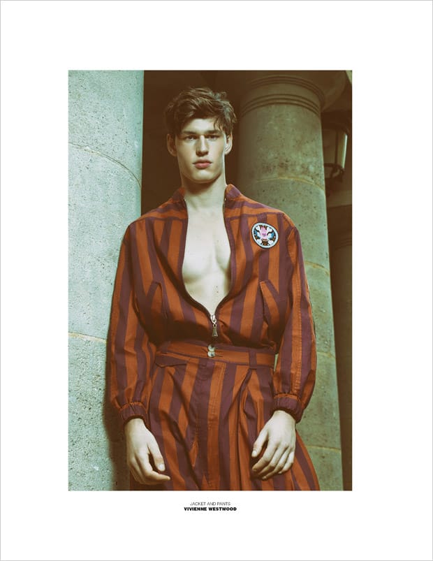 In charge of styling was Brian Placide, who for the session selected looks from Vivienne Westwood, Andrea Crews, Christian Dada, Issey Miyake, San Kuanz, and Kenzo. Photo assistance by Giuseppe Triscari, with digital retouching from Eddie Mendes. ” – Malemodelscene.net