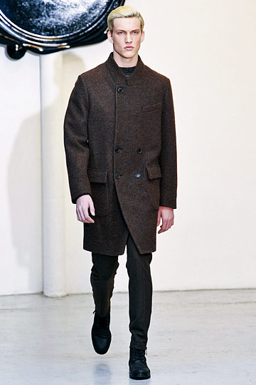 Another woolen pairing, this time in brown, came with a jacket–two-button with a steep lapel–and upturned cuffs; it was kind of brilliant, in a casually progressive way. Their suits cut a sharp silhouette, and play with their formalism, toying between pointed and shawl lapels. I also liked their trench coats, cinched high and forgoing the traditional button scheme, as well as the heavier duty overcoats, overflowing with shearling and boasting cowl necks that rose up to the nostrils.