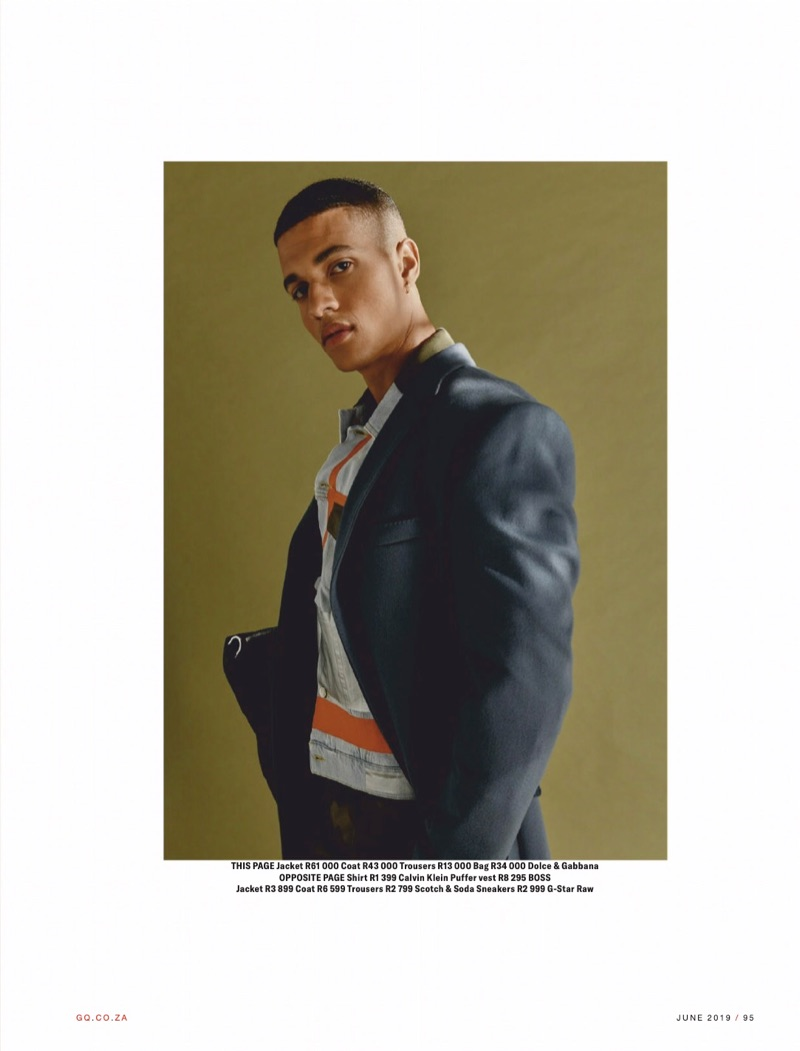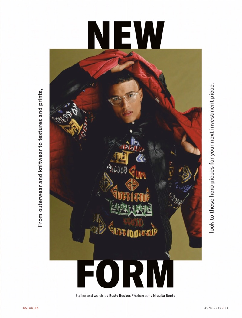 “Style finds a “New Form” as GQ South Africa explores investment pieces. Stylist Rusty Beukes curates a selection of timeless menswear for the occasion. Pulling from brands such as Antony Morato, Levi’s, and Gucci, Beukes outfits model Vincent F. (Circle Model Management). Meanwhile, Niquita Bento photographs the studio shoot. Front and center, Vincent wears everything from jackets and knitwear to tailored suits.” – TheFashionisto.com