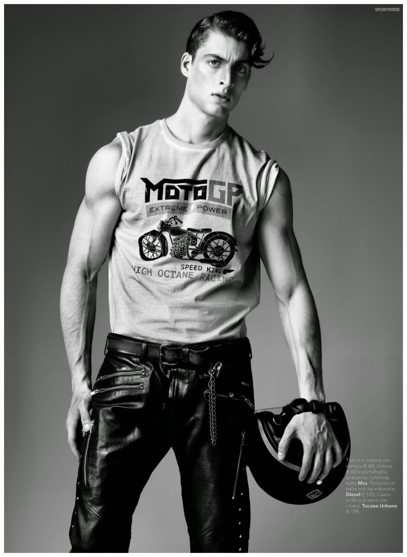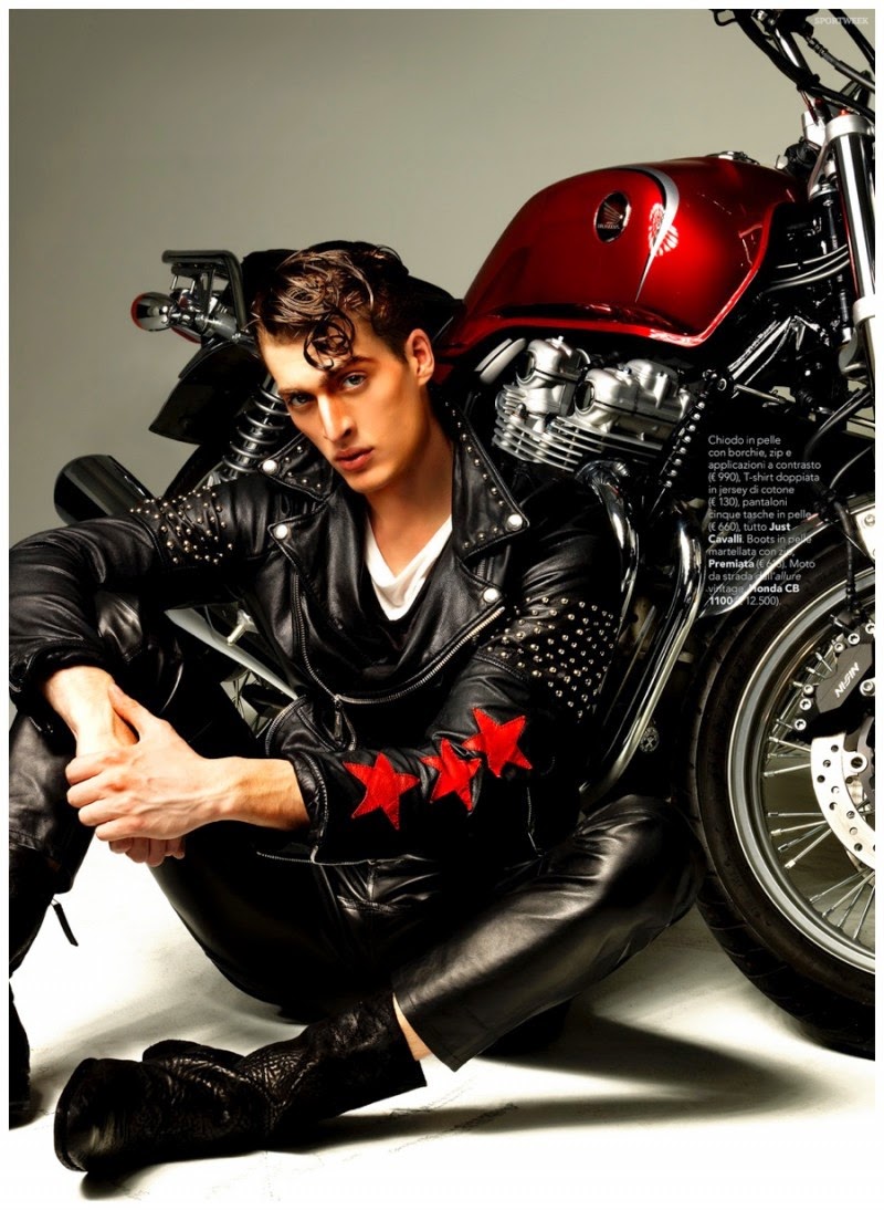 Photographed by Giovanni Squatriti, model Vincenzo Amato stars in an inspiring new fashion shoot for Sportweek. Posing for stunning images, Vincenzo rocks biker-inspired styles. Outfitted by stylist Carlo Ortenzi, Vincenzo delivers brilliant wardrobe options. Laying on motorcycles, Vincenzo models pieces from Diesel Black Gold, Just Cavalli, Versus Versace and more. Courtesy of – thefashionisto.com