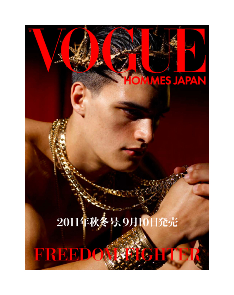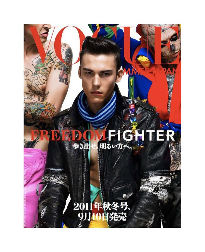 Freedom Fighter–Hedi Slimane captures Matt Ardell under the limelight for the fall issue of Vogue Hommes Japan. For the preview covers, Matthew Terry (Ford) teams up with Branislav Jankic, while Bradley Soileau as well as Chris Colton of Red Citizen join Rick Genest for a shoot with Terry Tsiolis. / Styling by Nicola Formichetti. Courtesy of – thefashionisto.com