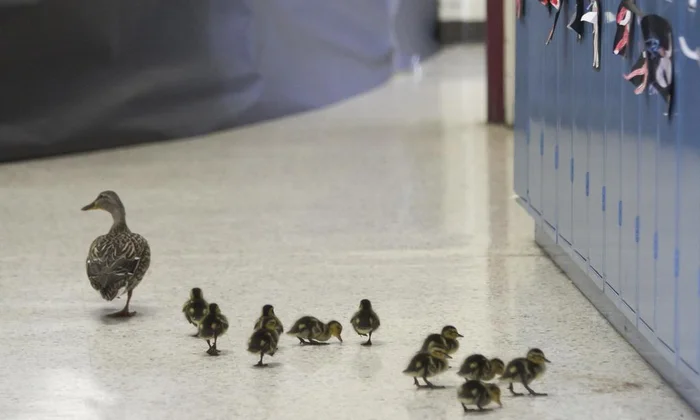 A gentle yearly ritual where a devoted duck leads her newborns through the school halls as students watch in quiet awe.