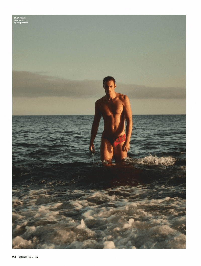 Elliot Meeten travels to Madeira for the July 2019 issue of Attitude. Starring in an editorial entitled “Water Sign,” the British model reunites with the magazine to showcase summer swimwear. Taking to the beach, Elliot appears before the lens of photographer Jenny Brough. Tapping into a season of leisure, Joseph Kocharian styles Elliot in swimwear and underwear. The British model wears brands such as Dsquared2, Ron Dorff, and Aussiebum.” – TheFashionisto.com