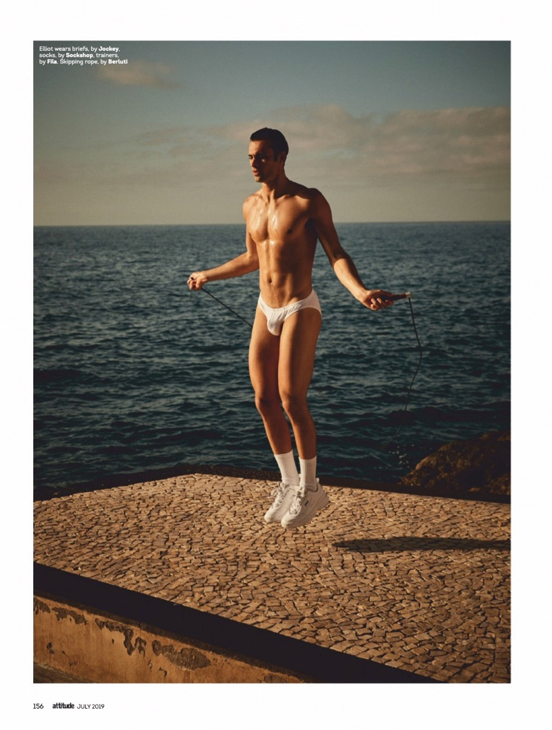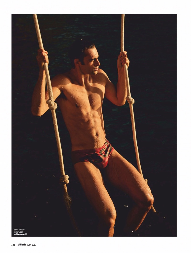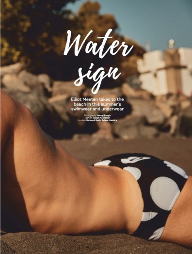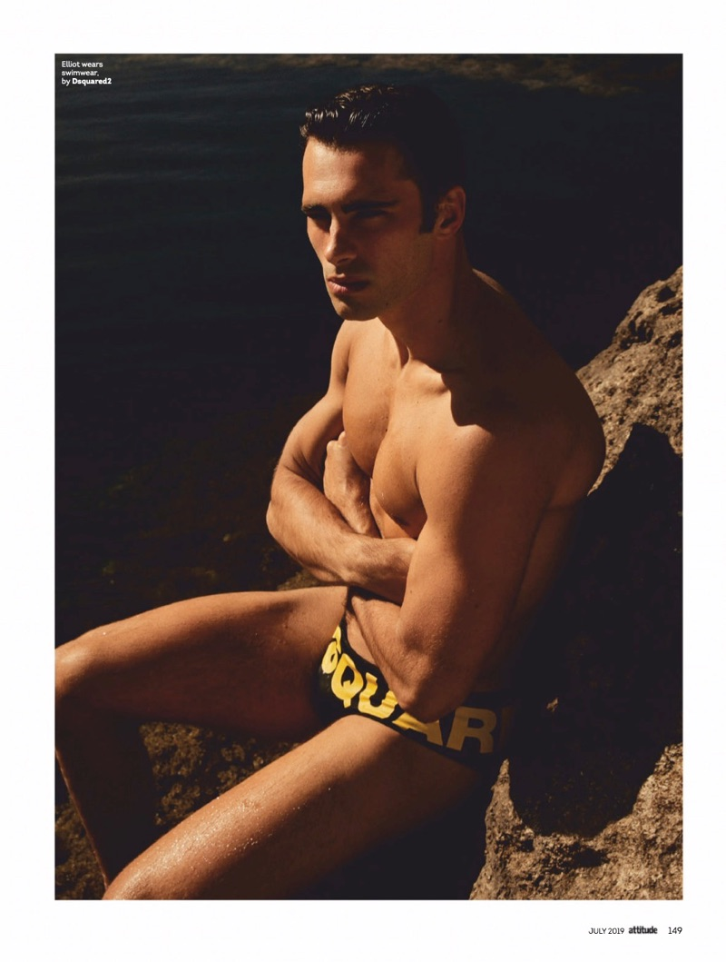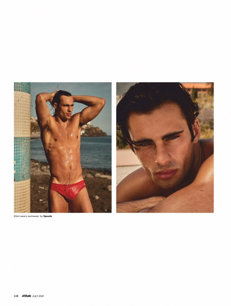 Elliot Meeten travels to Madeira for the July 2019 issue of Attitude. Starring in an editorial entitled “Water Sign,” the British model reunites with the magazine to showcase summer swimwear. Taking to the beach, Elliot appears before the lens of photographer Jenny Brough. Tapping into a season of leisure, Joseph Kocharian styles Elliot in swimwear and underwear. The British model wears brands such as Dsquared2, Ron Dorff, and Aussiebum.” – TheFashionisto.com